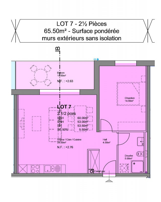 Situé dans l'immeuble D, ce lot est composé d'un hall d'entrée avec armoire murale, une salle de douche/WC avec coin buanderie, une chambre à coucher et une cuisine ouverte sur la pièce à vivre avec accès au balcon.