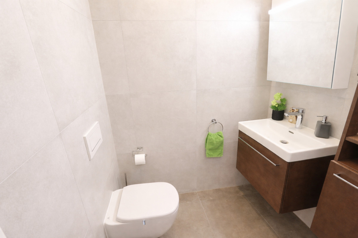 Il comprend également une chambre de 14.1 m², une chambre de 12.2 m², un grand réduit de 5 m², une salle d’eau de 5.6 m², équipée d’un coin pour les colonnes de lavage, d’une douche, d’un lavabo et d’un WC, ainsi qu’un WC visiteur séparé. L’appartement est équipé de stores électriques et de moustiquaires à toutes les fenêtres, ainsi que des variateurs de lumière.