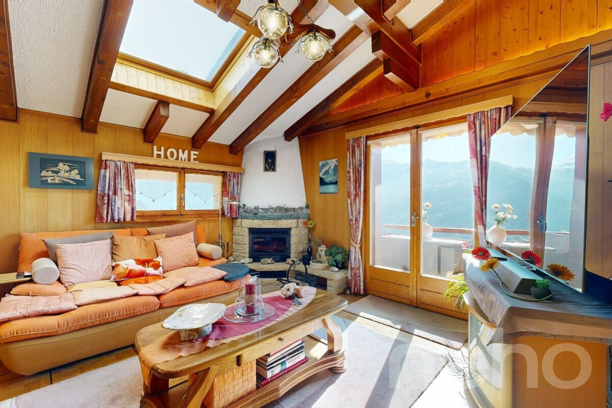 The main apartment stands out for its exceptional brightness and its full south-facing orientation, offering panoramic, unobstructed views of the surrounding mountains. Located on the top floor under the eaves of a well-maintained building, it exudes a warm and welcoming atmosphere typical of Alpine homes.