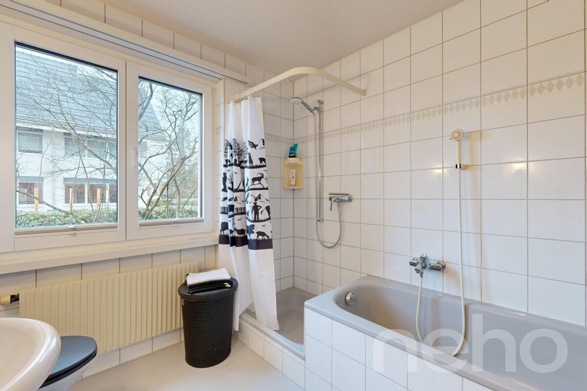 Das helle Badezimmer bietet sowohl eine Dusche als auch eine Badewanne und verfügt über Tageslicht. Zusätzlichen Komfort bieten der zur Wohnung gehörende private Allzweckraum mit eigenem Waschturm sowie ein separater Kellerraum.