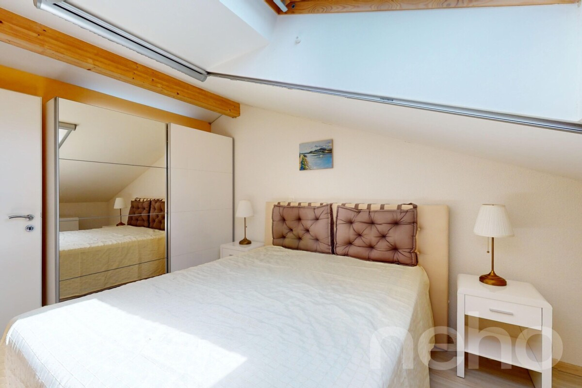 Aménagé sur deux étages, ce bien de 3,5 pièces allie volume et praticité. Il se compose de deux chambres confortables, d'une salle de bains moderne et d'un toilette séparé, assurant bien-être et commodité au quotidien.
