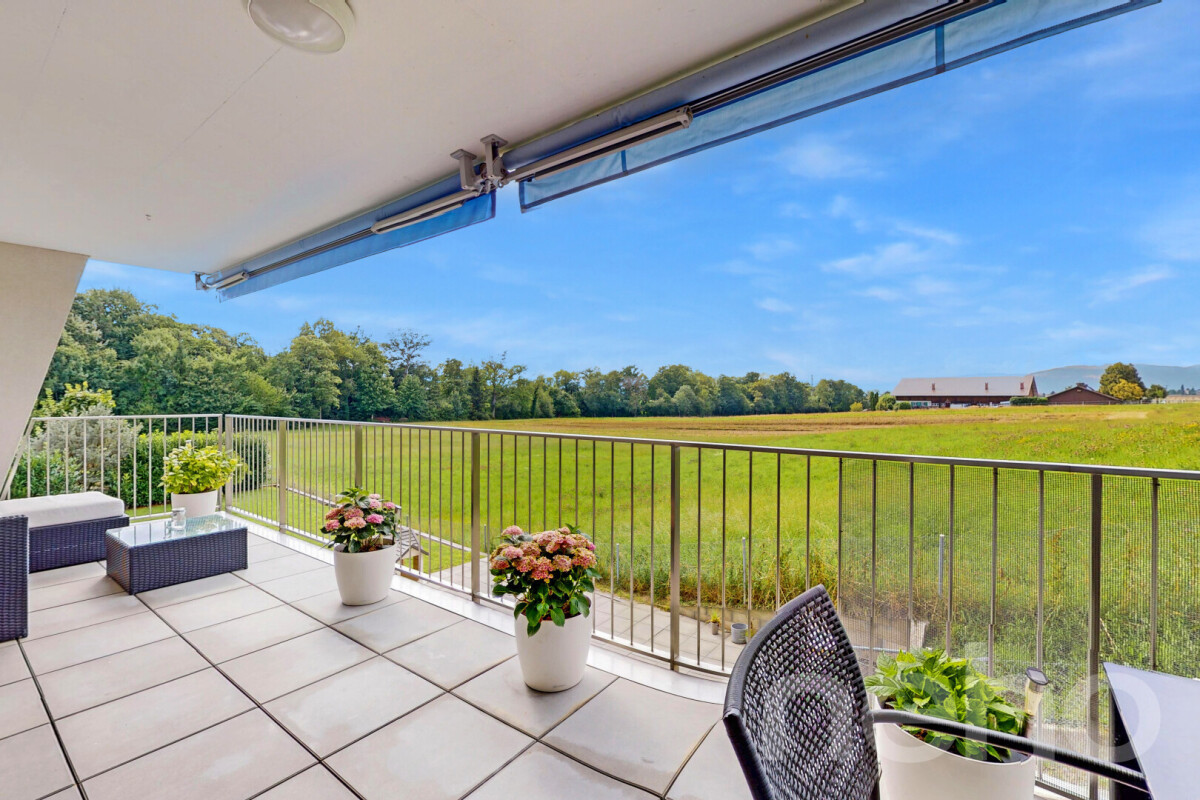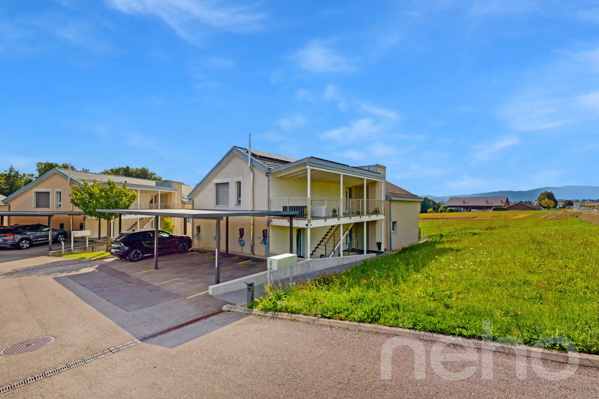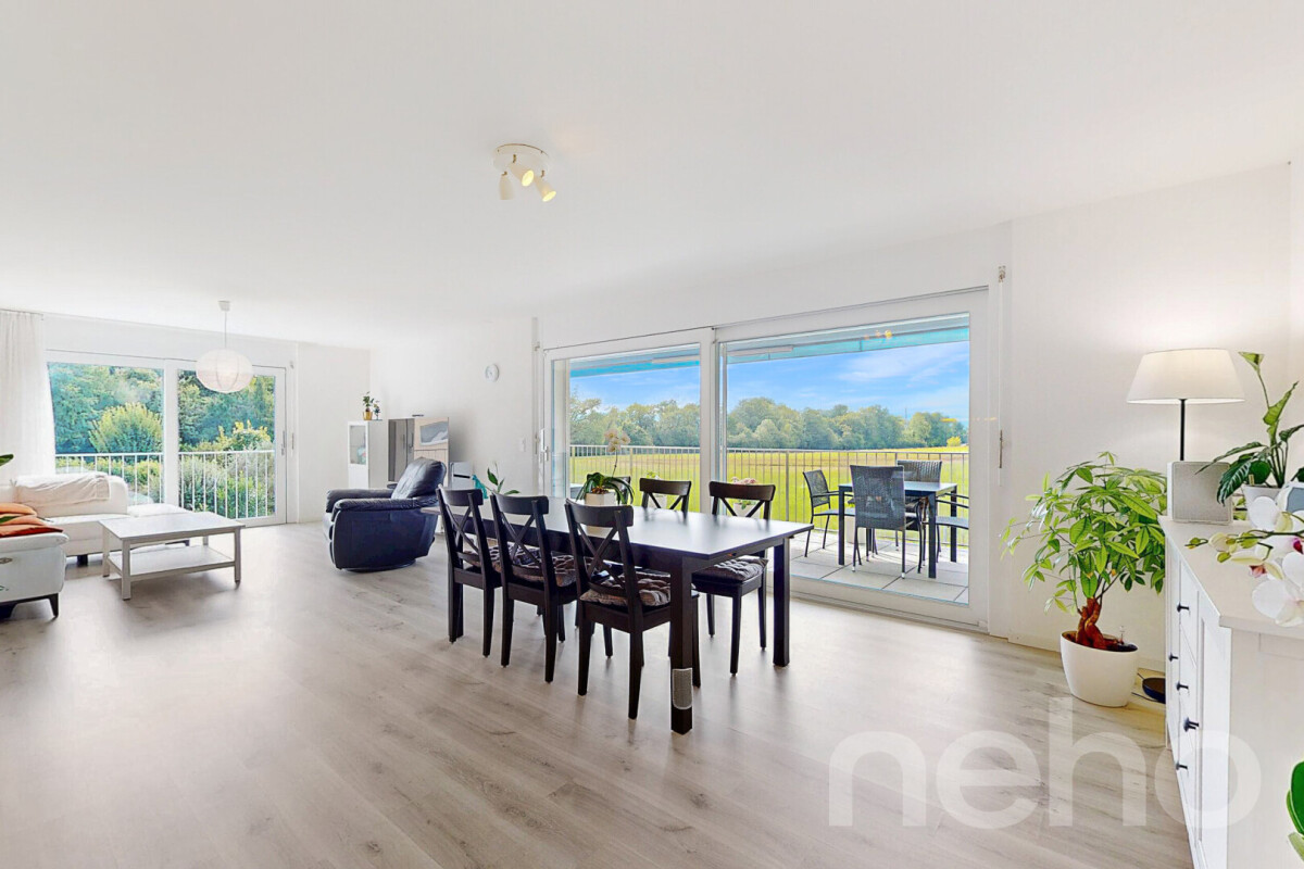 Découvrez ce grand appartement lumineux d'une surface habitable de 135 m2, bénéficiant d'une entrée totalement indépendante, offrant un cadre de vie à la fois confortable, fonctionnel et serein. A quelques minutes à pied du LEB et de tous commerces, situé au rez-de-chaussée surélevé, l'ensemble présente des finitions de qualité. Soigneusement entretenu au fil des années, cet appartement est immédiatement habitable et ne nécessite aucun gros ?uvre. L'espace de vie principal généreux s'ouvre sur un balcon de 20 m², vous permettant de jouir d'une vue entièrement dégagée sur les champs environnants en vous offrant une agréable sensation d'ouverture et de tranquillité. Le bien comprend quatre chambres de belles dimensions. La suite parentale dispose de sa propre salle de douche. L'une des chambres bénéficie d'un accès indépendant, offrant ainsi la possibilité d'une chambre d'appoint autonome ou d'un lieu parfaitement adapté à un adolescent.  L'appartement répond par ailleurs aux plus hautes exigences en matière de performance énergétique: il est équipé de panneaux solaires photovoltaïques et thermiques, d'une pompe à chaleur géothermique réversible (geocooling), de triples vitrages ainsi que d'une borne de recharge pour véhicule électrique (place de parc en sus - CHF 20'000). Une place de parc supplémentaire pourra être louée si nécessaire.