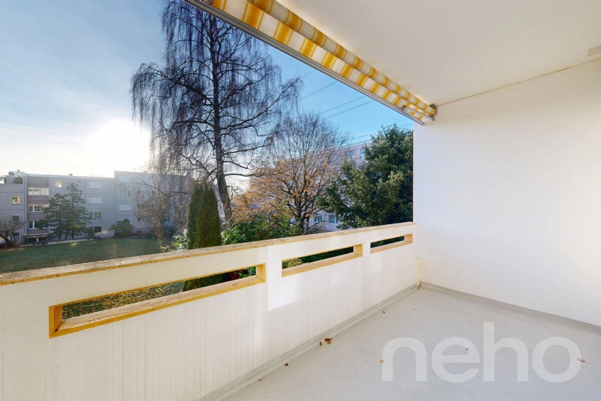 Der Wohn- und Essbereich ist grosszügig geschnitten und bildet das Herz der Wohnung. Von hier aus gelangt man direkt auf den Balkon, der den Wohnraum nach aussen erweitert und für zusätzliche Aufenthaltsqualität sorgt. Die Küche ist separat angeordnet und funktional erschlossen, mit direktem Bezug zum Wohnbereich.