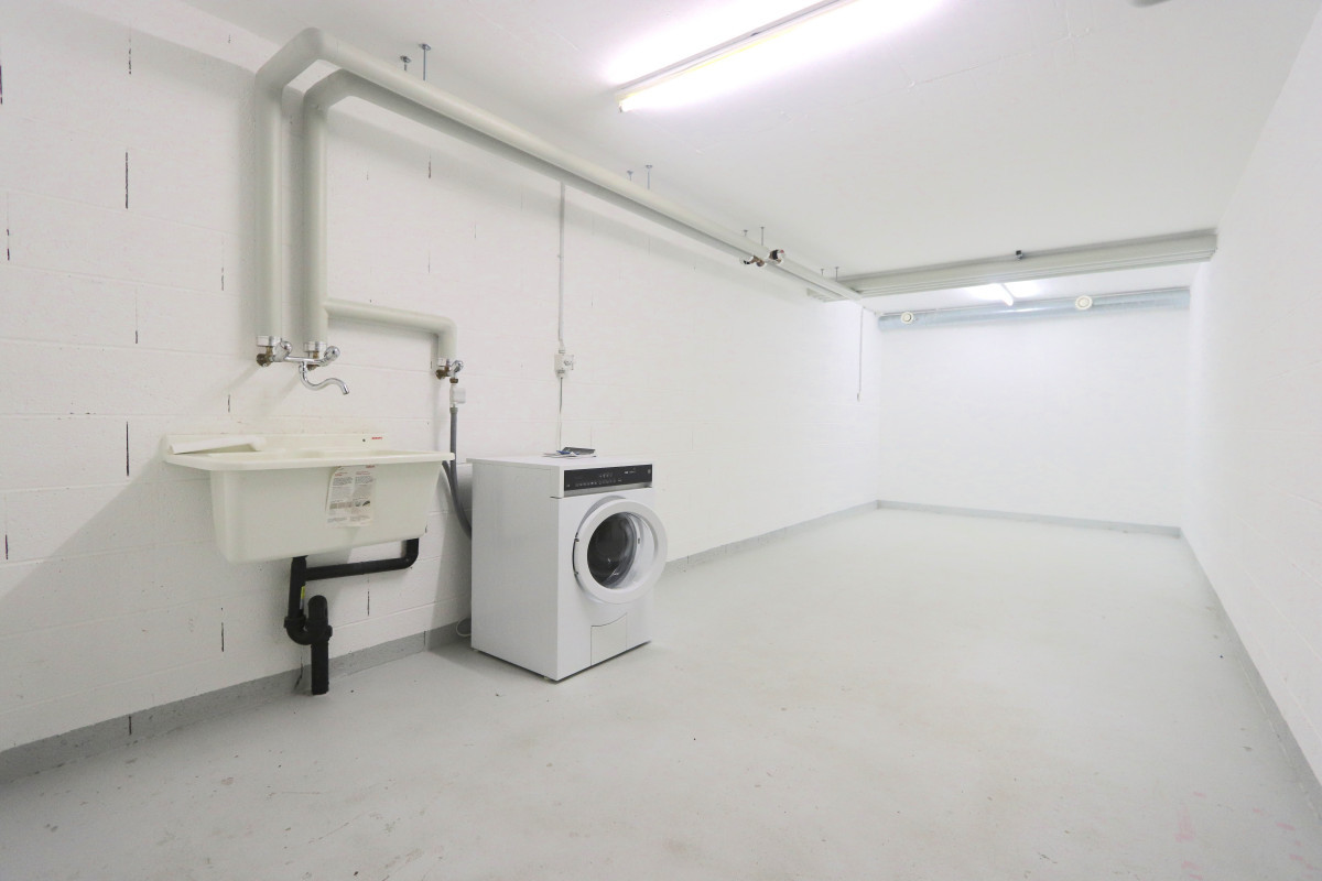 Le sous-sol comprend une cave privative de 23 m2 avec un lavabo, l'électricité et l'écoulement pour une colonne de lavage et un garage à vélos en commun utilisé pour les pneus et poussettes.