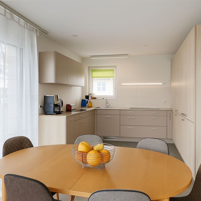 La vaste pièce de vie, baignée de lumière, réunit un salon chaleureux, une salle à manger conviviale avec accès direct à la terrasse, ainsi qu'une cuisine ouverte entièrement équipée, pensée pour répondre aux exigences modernes.