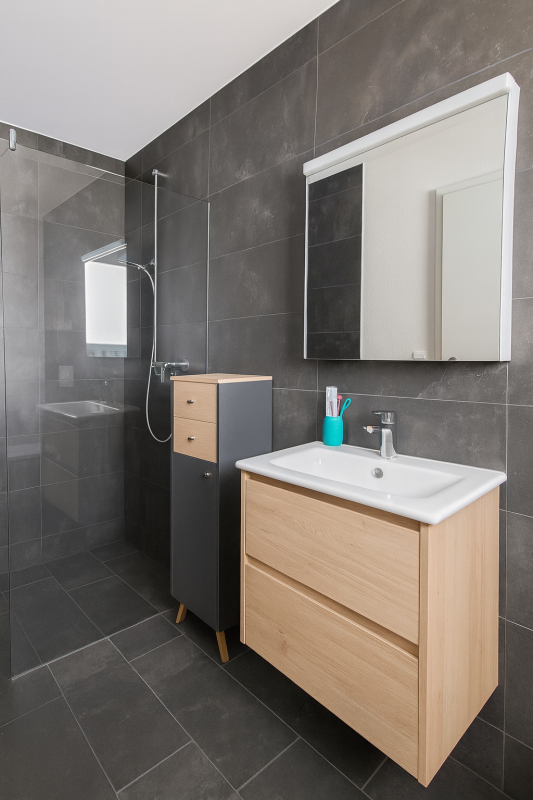 Une deuxième salle de bain, avec baignoire et colonne de lavage, complète la disposition.