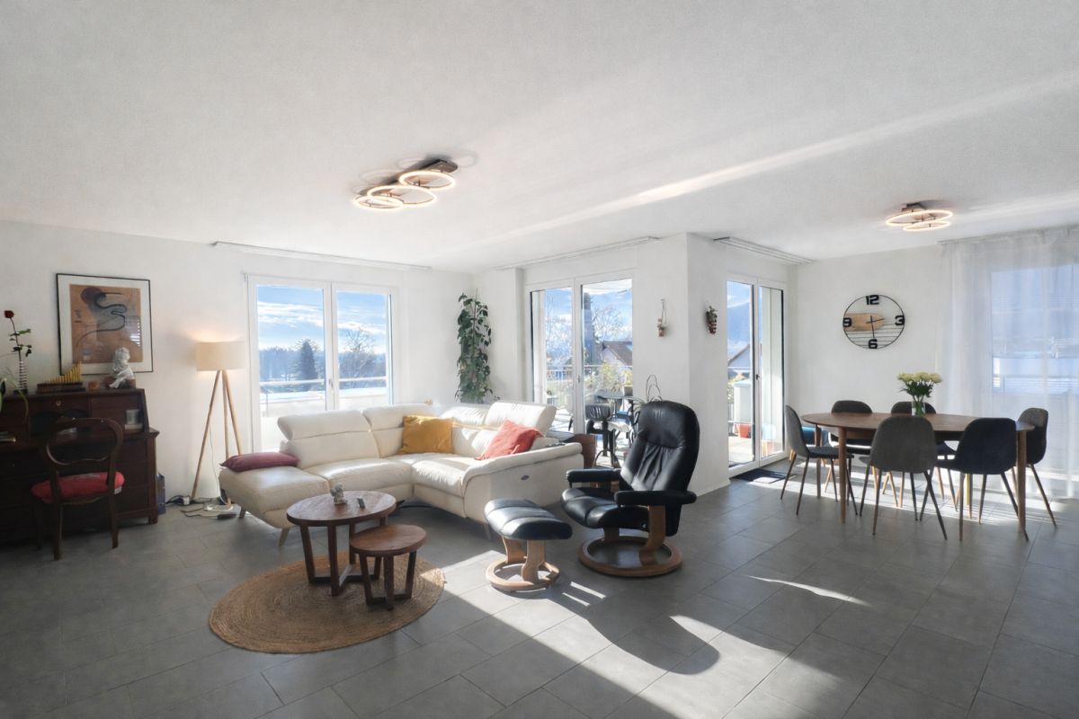 L'impressionnante terrasse de 83,5 m², faisant le tour de l'appartement, constitue un véritable espace de vie supplémentaire. Elle offre une vue panoramique imprenable sur les Alpes et le Seeland, tout en bénéficiant d'un ensoleillement optimal grâce à son orientation sud-ouest.