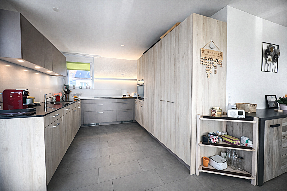 La vaste pièce de vie, baignée de lumière, réunit un salon chaleureux, une salle à manger conviviale avec accès direct à la terrasse, ainsi qu'une cuisine ouverte entièrement équipée, pensée pour répondre aux exigences modernes.