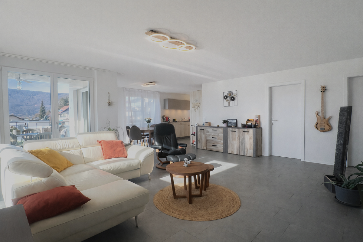L'impressionnante terrasse de 83,5 m², faisant le tour de l'appartement, constitue un véritable espace de vie supplémentaire. Elle offre une vue panoramique imprenable sur les Alpes et le Seeland, tout en bénéficiant d'un ensoleillement optimal grâce à son orientation sud-ouest.