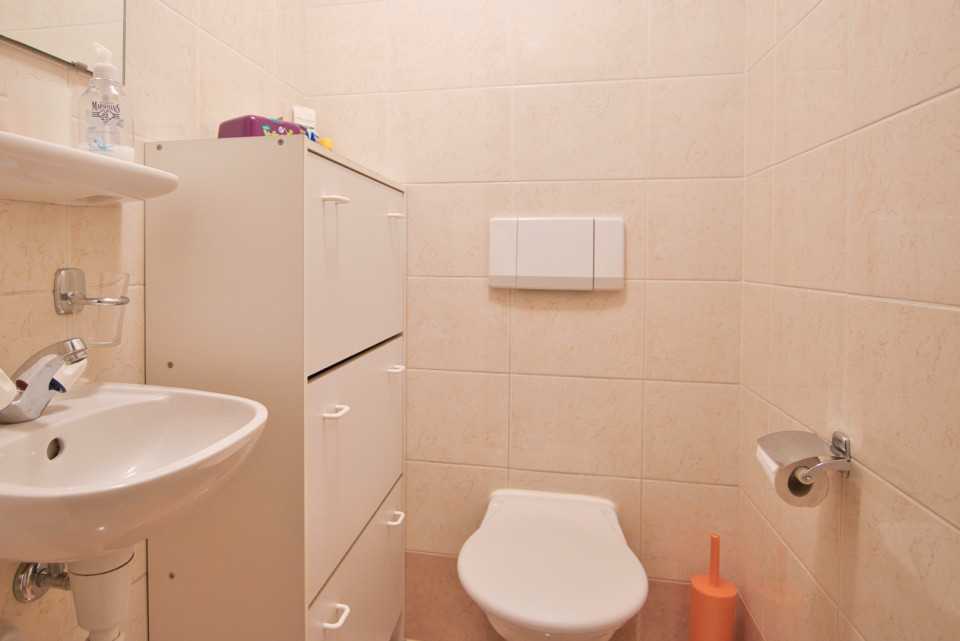 1 hall d’entrée, 1 séjour avec accès au balcon, 1 cuisine fermée entièrement équipée, 1 chambre parentale avec salle de bains (WC et lavabo), 2 chambres, 1 salle de douche avec lavabo, 1 WC visiteurs avec lavabo et 1 balcon.