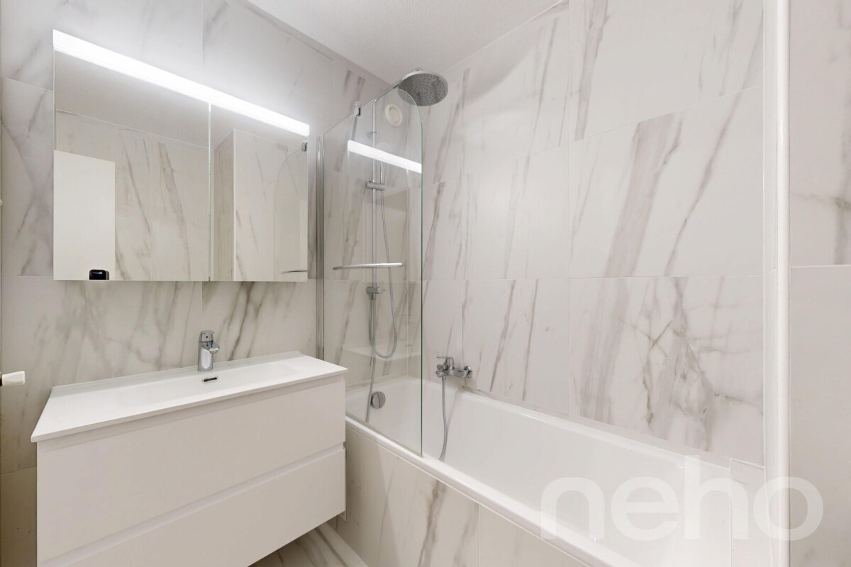 L'appartement dispose de deux chambres confortables, dont une avec accès au balcon, d'une salle de bain design avec baignoire et d'un WC séparé. De nombreux rangements viennent compléter l'ensemble.