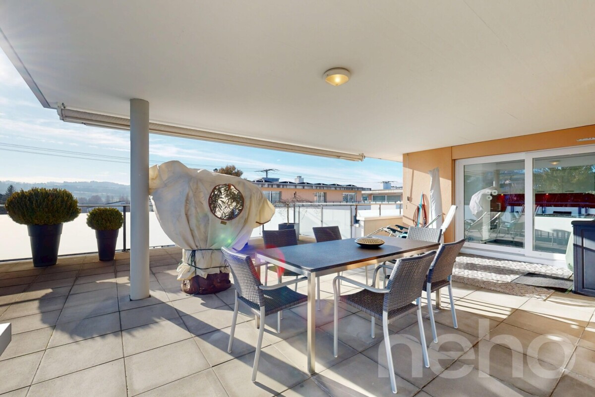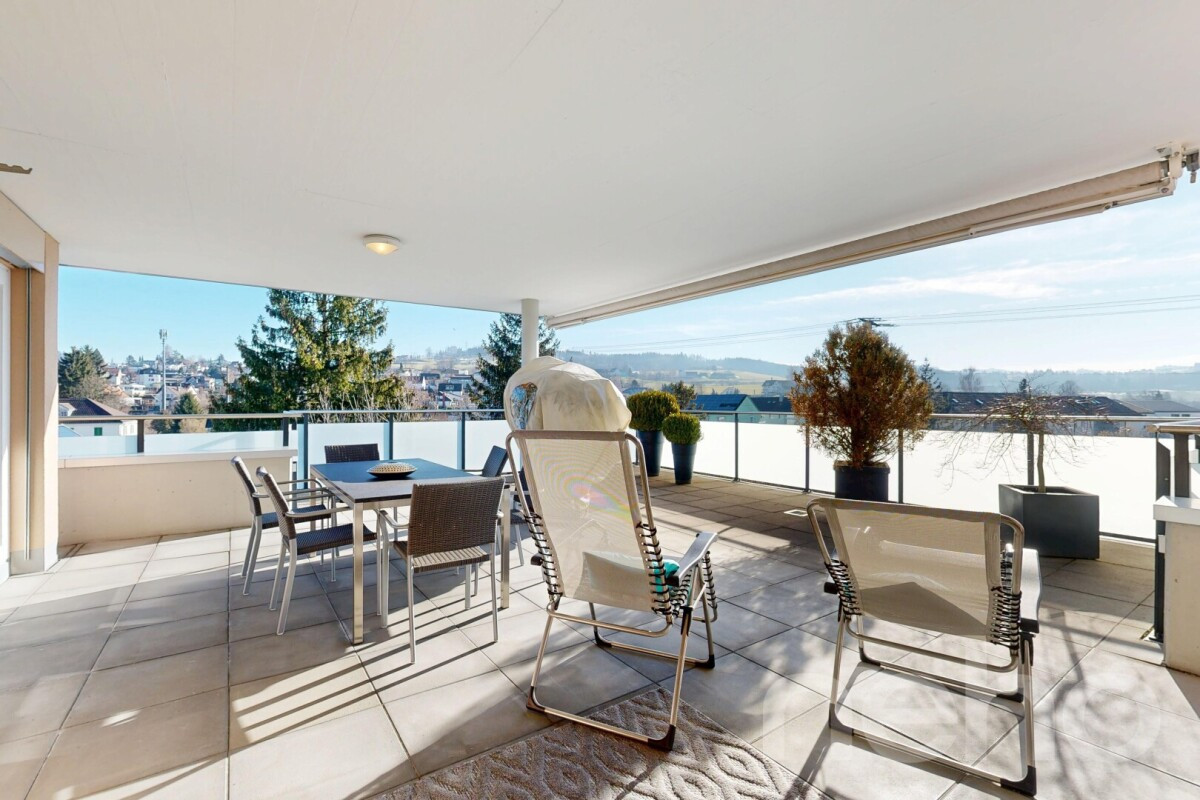 Die Sonnenterrasse mit ca. 60 m2 lädt zum Verweilen und Geniessen ein, während der Rundlauf um die Wohnung rund 44 m2 bietet.