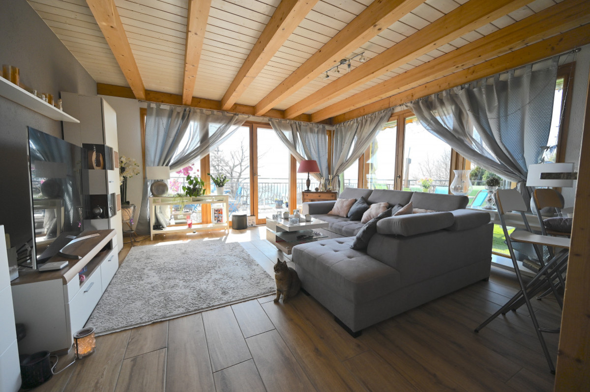 Appartement avec balcon et vue sur le lac!Très joli appartement situé au dernier étage d'un immeuble en PPE comprenant 6 lots, offrant une vue partielle sur le lac. Pas d'ascenseur.Initialement conçu avec 4,5 pièces, l'appartement a été réaménagé pour offrir actuellement 3,5 pièces. Il dispose d'une cuisine entièrement équipée ouverte sur un spacieux salon agrémenté d'un poêle à bois....