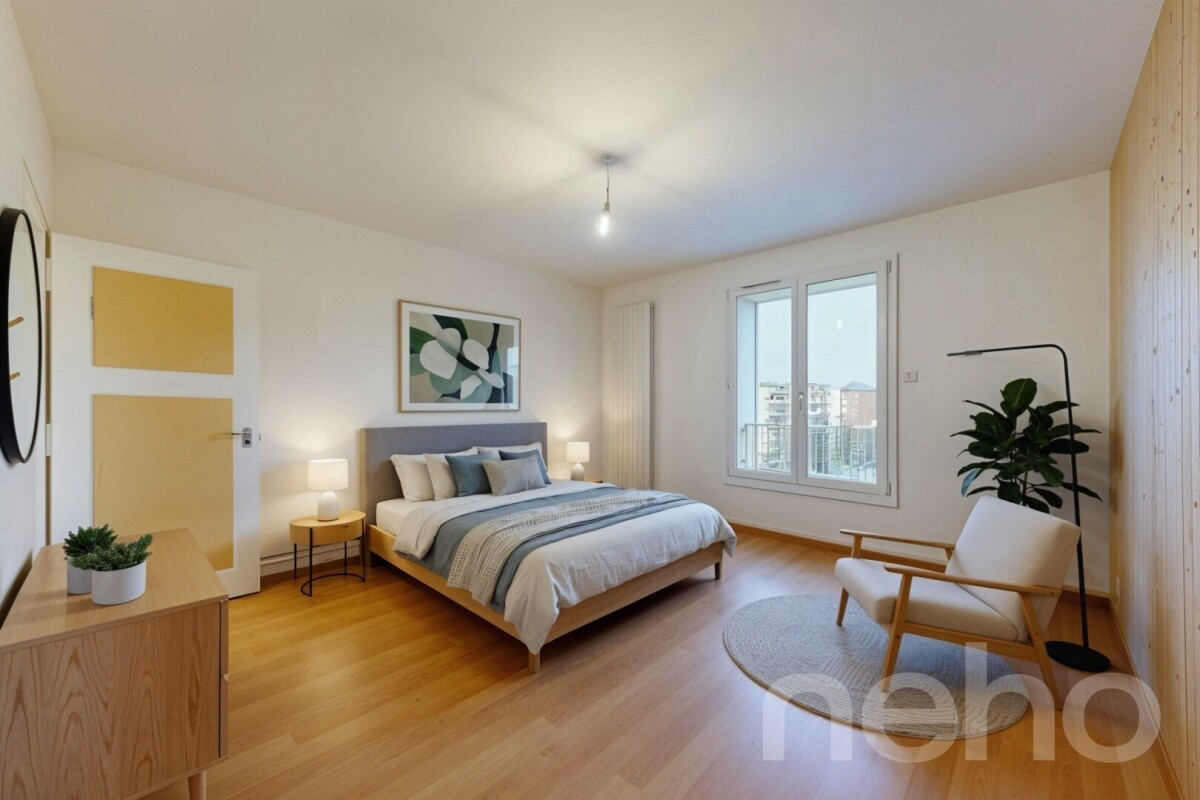 Occupant le dernier étage de l'immeuble, il profite d'une luminosité remarquable et d'une vue dégagée sur les Alpes, sans aucun vis-à-vis. La pièce de vie, orientée sud-ouest, bénéficie d'un ensoleillement optimal grâce à de grandes ouvertures, dont une porte-fenêtre donnant accès au balcon.