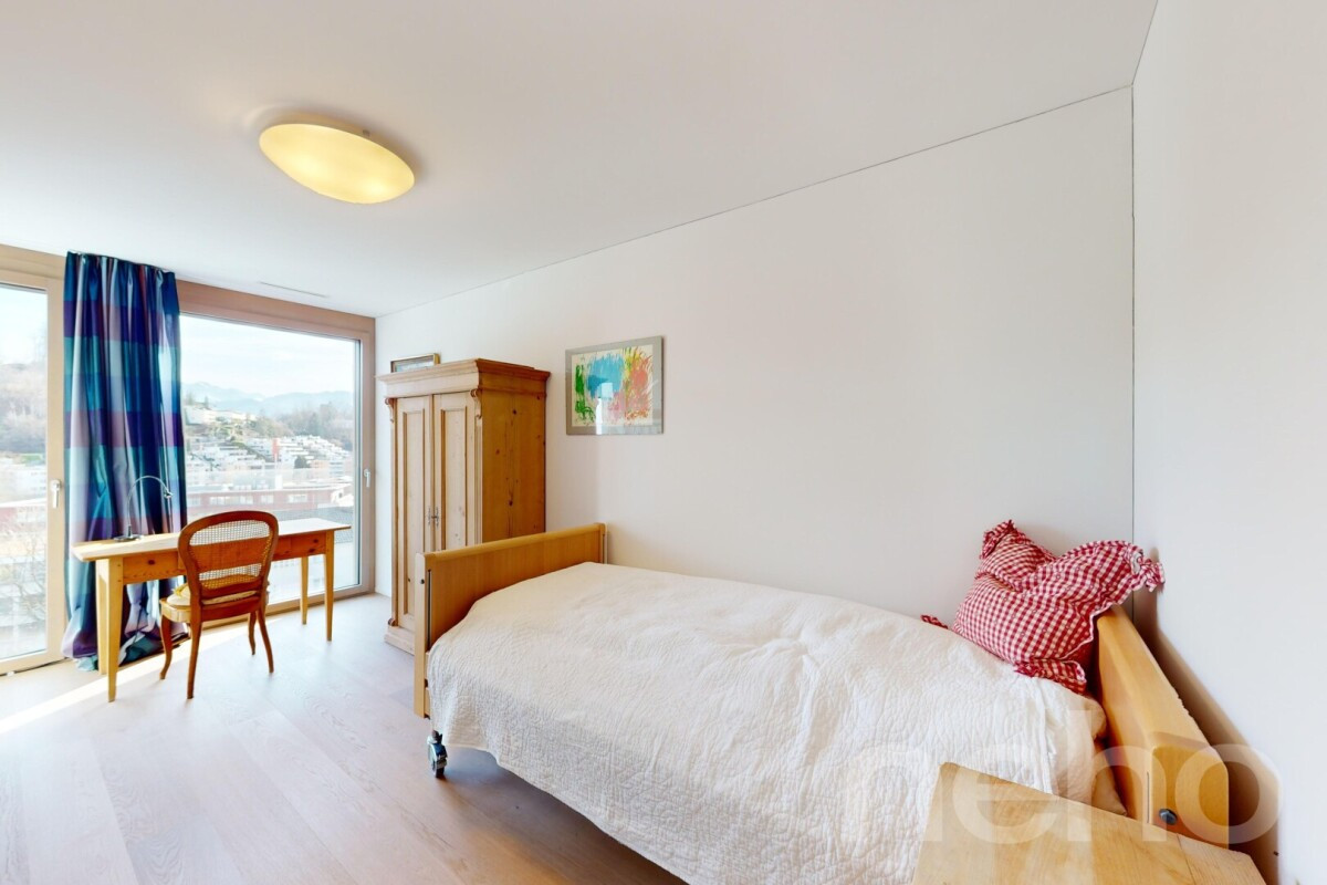Vier geräumige Schlafzimmer und zwei Badezimmer sorgen für ausreichend Platz für Familien. Der Grundriss im 2. OG kann jedoch individuell angepasst werden, da die Wände zwischen den Schlafzimmern nicht tragend sind. Im Attikageschoss befindet sich das lichtdurchflutete Wohnzimmer mit der luxuriös ausgestatteten Küche und den beiden Terrassen mit eindrücklicher und unverbaubarer Panoramasicht über die Stadt Luzern mit See und Bergsicht. Die beiden Wohngeschosse sind von der Einstellhalle barrierefrei mit dem Aufzug erreichbar.