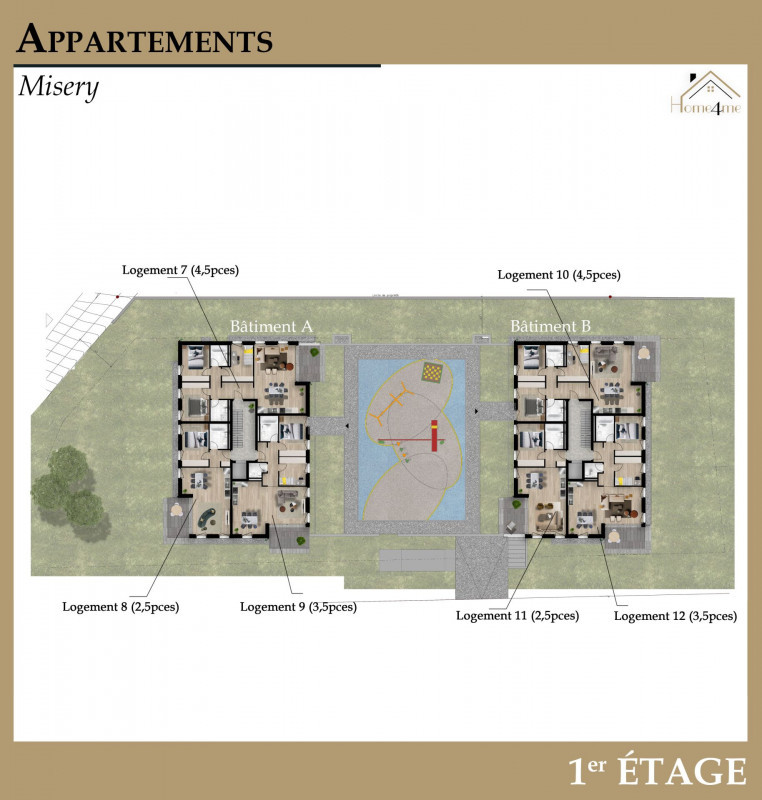 Construits au coeur de la commune, les deux immeubles d'habitation offrent une situation centrale : à 5 minutes à pied des transports publics et des commerces, tous vos besoins sont à portée de main. S'élevant le long d'un jardin arboré, les immeubles de 3 étages jouissent d'une exposition plein sud, offrant aux appartements un bel ensoleillement.