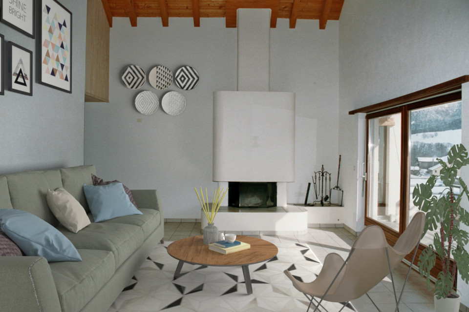 Grand séjour lumineux avec cheminée de salon moderne, baies vitrées avec accès au balcon et à la terrasse, grand volume avec poutres et lambrissage bois au plafond.