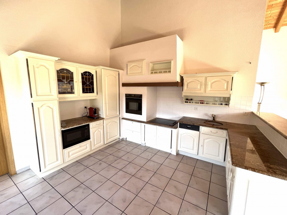 Cuisine ouverte agencée avec plans de travail en granit, frigo avec congélateur, four en hauteur, plan de cuisson vitrocéramique, hotte d'aspiration, micro-ondes, lave-vaisselle, armoires murales, ilot avec rangements et plan en granit.