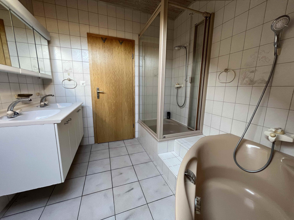 Salle de bain avec baignoire, cabine douche, lavabo double, meuble et armoire murale.