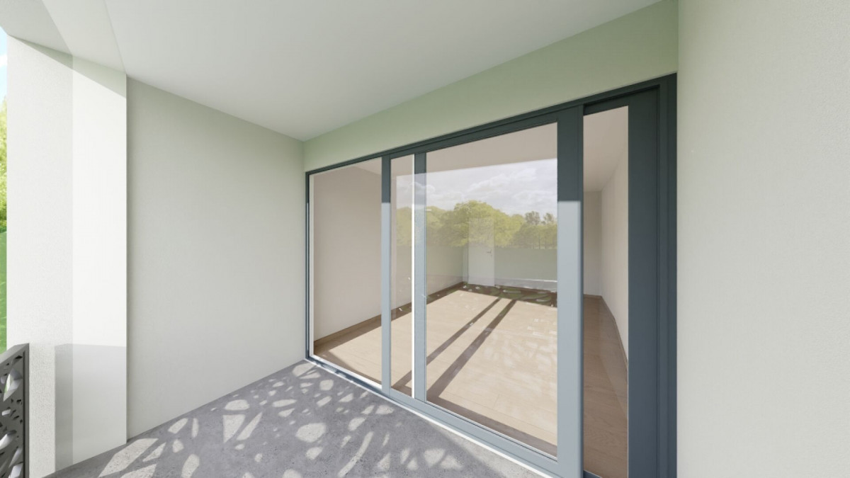 Le cinquième et dernier étage offre deux appartements de 2.5 pièces, chacun avec deux terrasses de chaque côté, procurant une vue panoramique et un espace extérieur étendu.