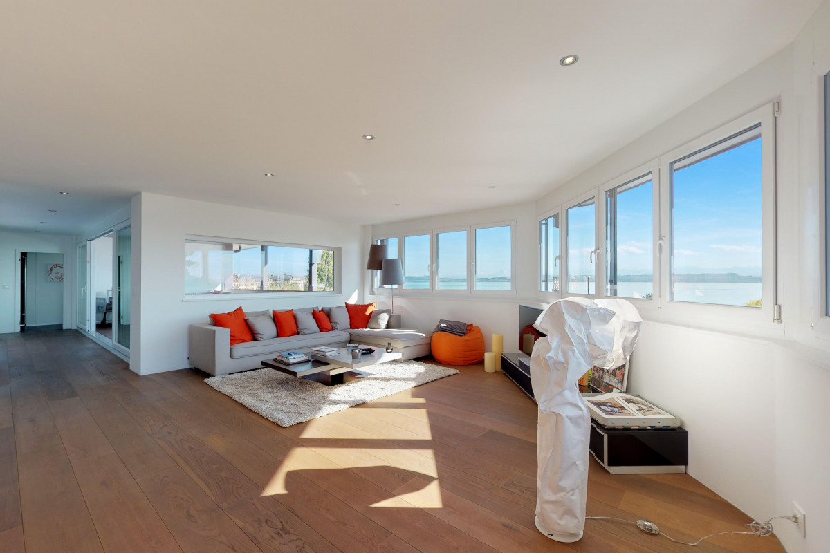 A rare opportunity, this penthouse offers an exclusive living environment located near the lake and the historic center of Neuchâtel. An unobstructed panoramic view of the bay of Evole, the lake and the Alps. This unique property offers a standard resolutely premium design in a contemporary home style with a loggia of 27 m2 and a sauna wellness area.