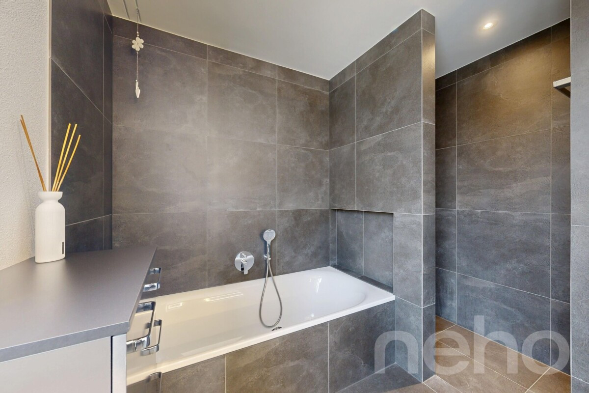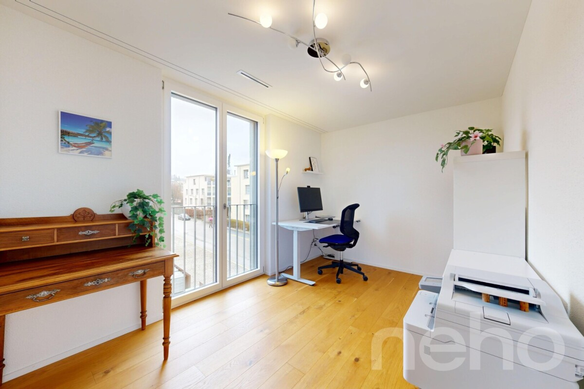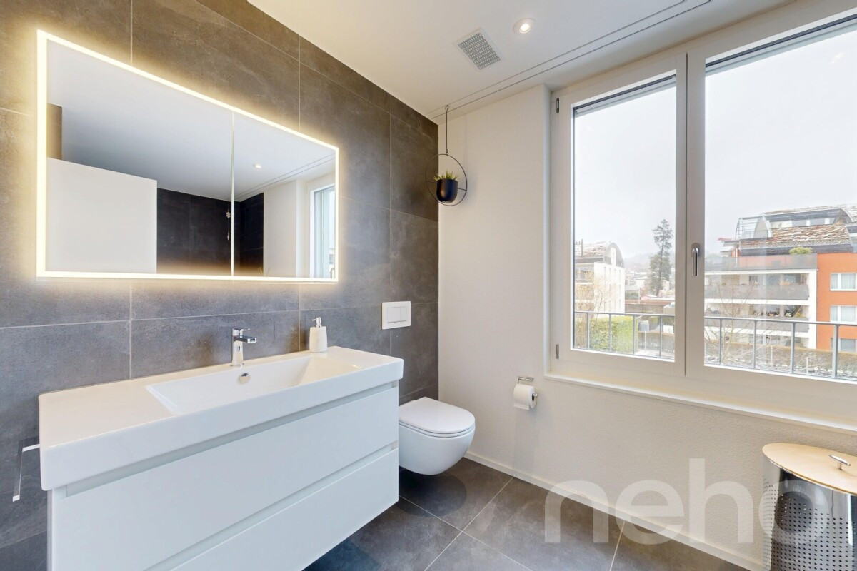 Drei gut proportionierte Zimmer ermöglichen eine flexible Nutzung als Schlafzimmer, Kinderzimmer oder Büro. Das Hauptbad und das separate WC mit Dusche präsentieren sich in modernem Design mit hochwertigen Materialien. In sämtlichen Wohn- und Schlafräumen wurde edles Eichenparkett verlegt, während die Nasszellen mit grossformatigen Keramikplatten ausgestattet sind. Waschmaschine und Tumbler befinden sich im Reduit des Eingangsbereiches, können aber auch im Keller untergebracht werden.