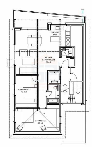 Le futur 4 pièces de 107 m2 au premier étage et dernier étage sera distribué de la manière suivante, un hall avec un WC visiteur et une cuisine ouverte sur le séjour et la salle à manger avec un accès au balcon de 16m2.