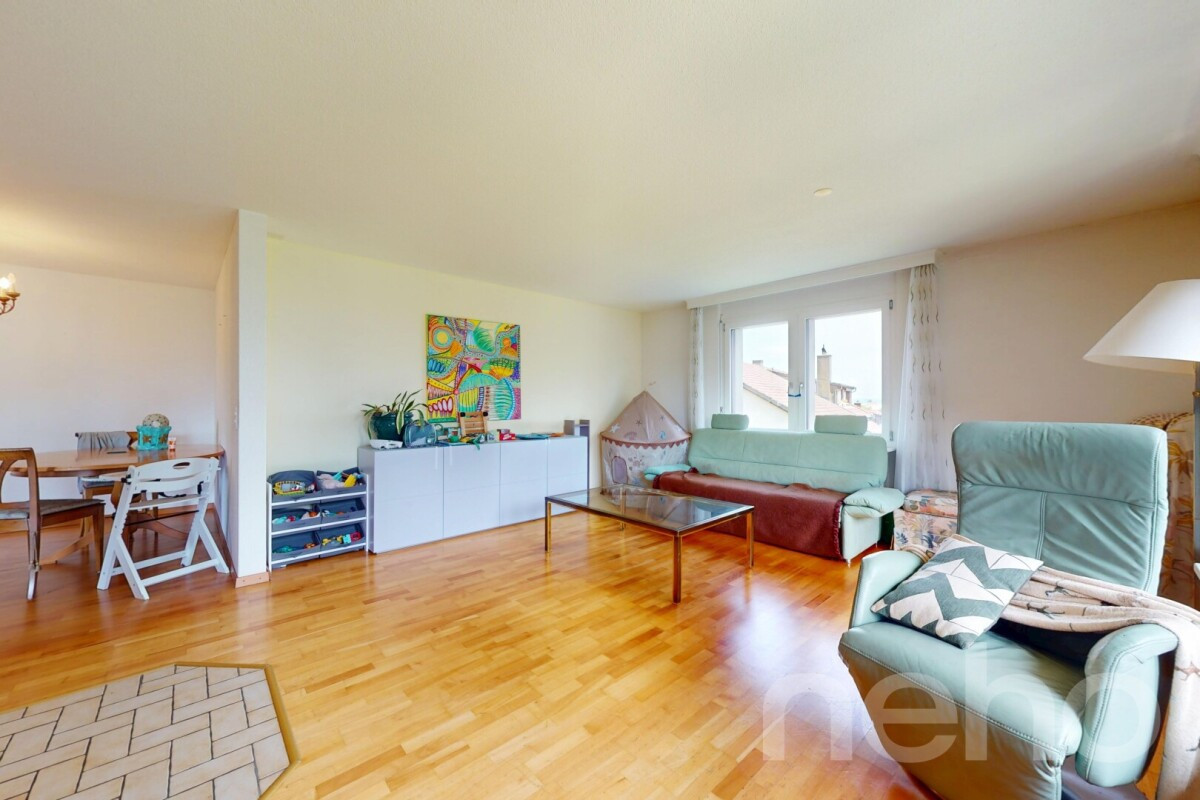 Der helle Wohn- und Essbereich mit Zugang zum gedeckten Balkon bildet das Herzstück der Wohnung. Ein Cheminée sorgt dabei für eine angenehme Wohnatmosphäre. Die separate Küche mit angrenzender Speisekammer ist funktional ausgestattet. Drei Schlafzimmer sowie zwei Badezimmer (eines mit Badewanne und Doppellavabo, eines mit Dusche) bieten eine flexible Nutzung.