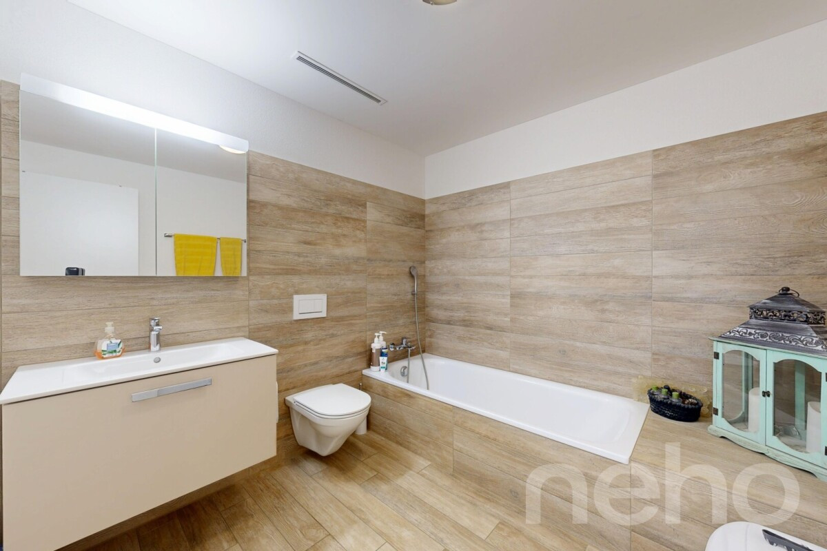 Der Wohn- und Essbereich ist offen gestaltet und verfügt über eine elegante Küche mit modernen Geräten. Das grosse Elternzimmer punktet mit eigener Ankleide und einem Bad en Suite. Zusätzlich stehen ein weiteres Bad sowie ein praktisches Reduit mit Waschturm zur Verfügung. Ein Lift führt bequem von der Tiefgarage bis vor die Wohnung.