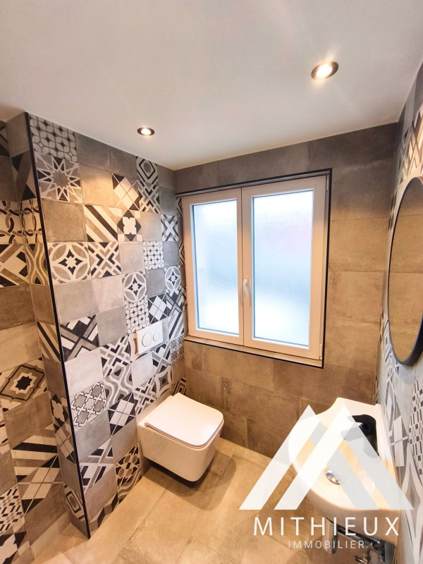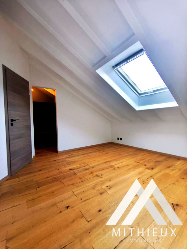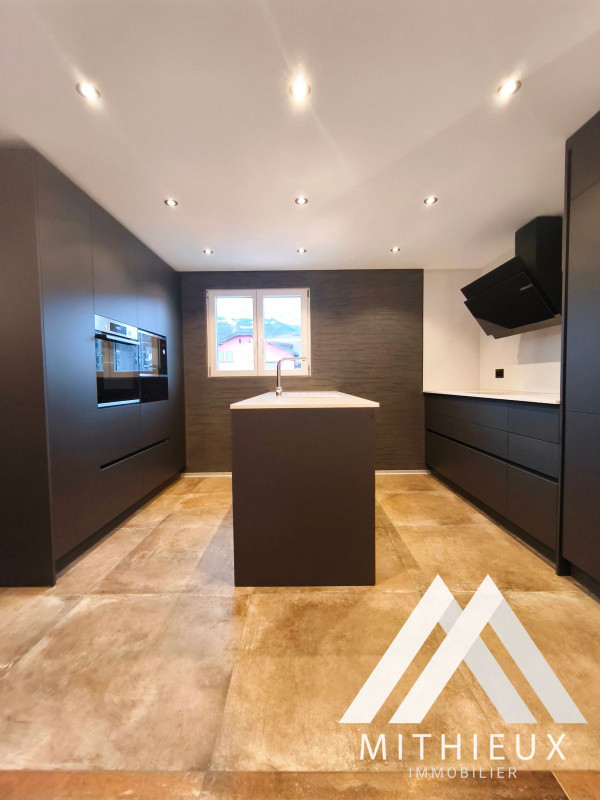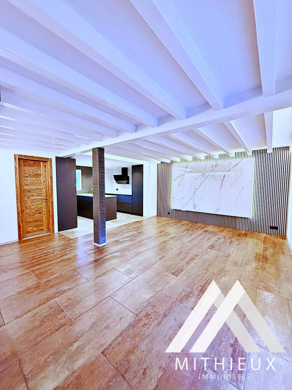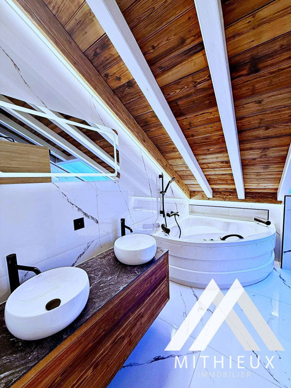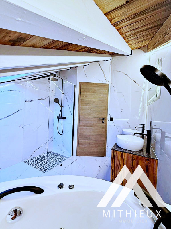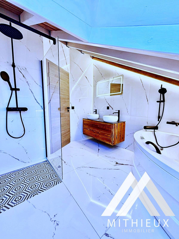 Dès l'entrée, le premier niveau dévoile un espace de vie harmonieux et raffiné : une cuisine ouverte moderne, entièrement refaite avec des finitions de qualité et équipée d'électroménagers Bosch, s'intègre parfaitement au séjour spacieux et lumineux. Celui-ci s'ouvre sur une superbe terrasse de 24 m², véritable prolongement de l'espace de vie, offrant une vue dégagée spectaculaire sur les montagnes. Un WC visiteurs complète ce niveau.