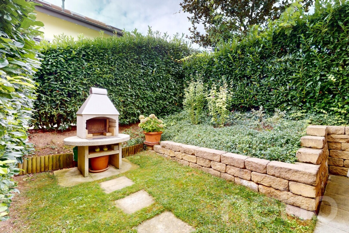At the foot of the building, the flat has a terrace and a small garden with a barbecue.