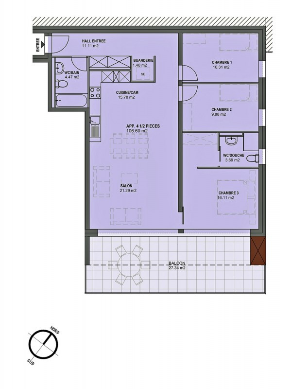 Ce bel appartement avec son balcon de 27 m2 vous séduira certainement, l'intérieur est disposé comme suit :