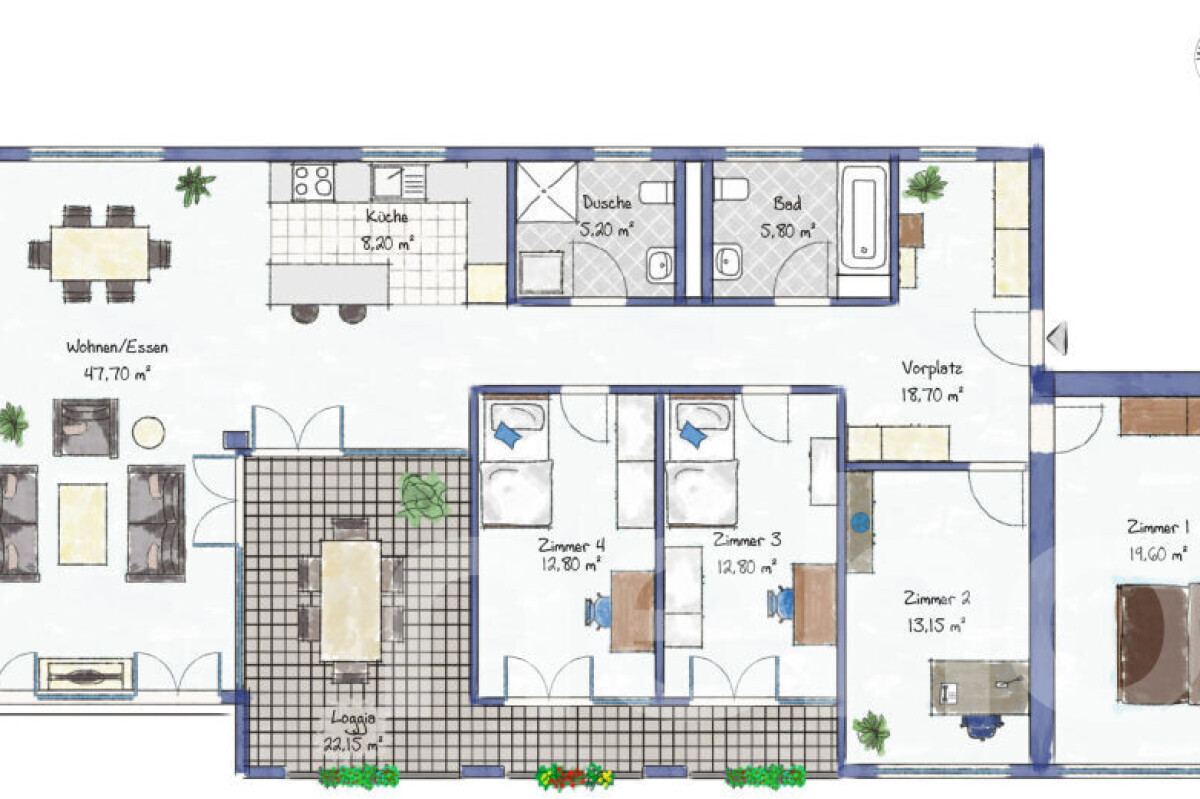Mit rund 144 m² Wohnfläche und einer grossen, gedeckten Loggia von ca. 22 m² bietet die Wohnung viel Raum für komfortables Wohnen, Arbeiten und Entspannen. Der Wohn- und Essbereich ist klar gegliedert und schafft eine angenehme Trennung zwischen Wohnen und Essen. Die grosszügige Küche ist optimal beim Essbereich positioniert und bietet ausreichend Arbeits- und Stauraum.