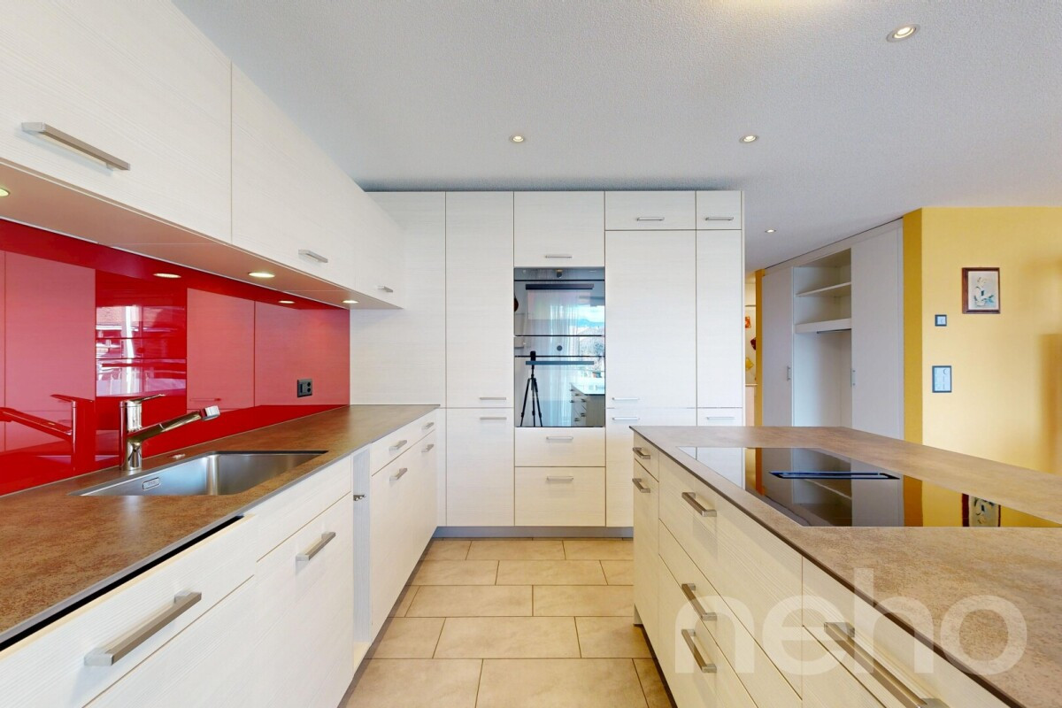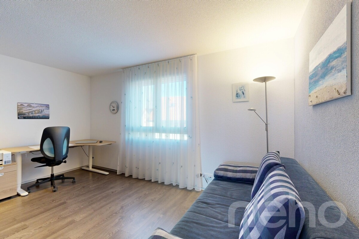 Die Hauptnasszelle verfügt über Badewanne und Walk-in-Dusche. Ergänzt wird sie durch ein Gäste-WC mit Waschturm (2022) und zusätzlicher, flexibel nutzbarer Dusche. Ein praktisches Reduit innerhalb der Wohnung bietet zusätzlichen Stauraum. Bodenheizung, elektrische Storen sowie ein sonniger Balkon mit Weitsicht bis in die Voralpen und Aussen-Reduit mit Wasser- und Stromanschlüssen sorgen für hohen Wohnkomfort. Ein grosser privater Keller mit Stromanschluss sowie zusätzlicher Stauraum bei einer der Tiefgaragen runden das Angebot ab.