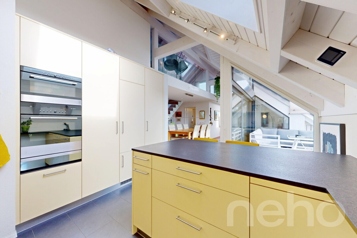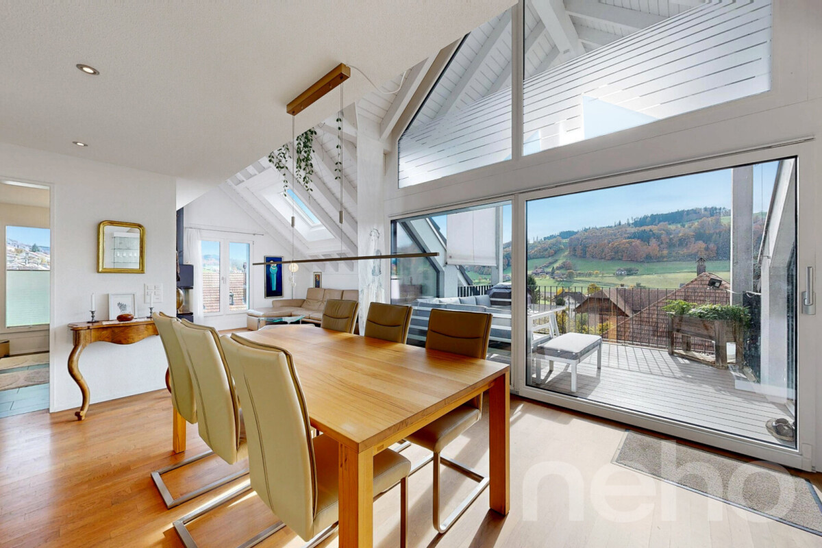 Die Hauptebene überzeugt mit einem grosszügigen Wohn- und Essbereich, edlem Schwedenofen und einer hochwertigen, voll ausgestatteten Küche inklusive Weinkühlschrank. Die überdachte Loggia mit elektrischen Markisen eröffnet einen traumhaften Blick über die Landschaft - bei klarer Sicht bis in die Alpen. Die komfortablen Zimmer sowie die modernen Nasszellen mit Dusche und Badewanne sorgen für ein harmonisches Wohngefühl.