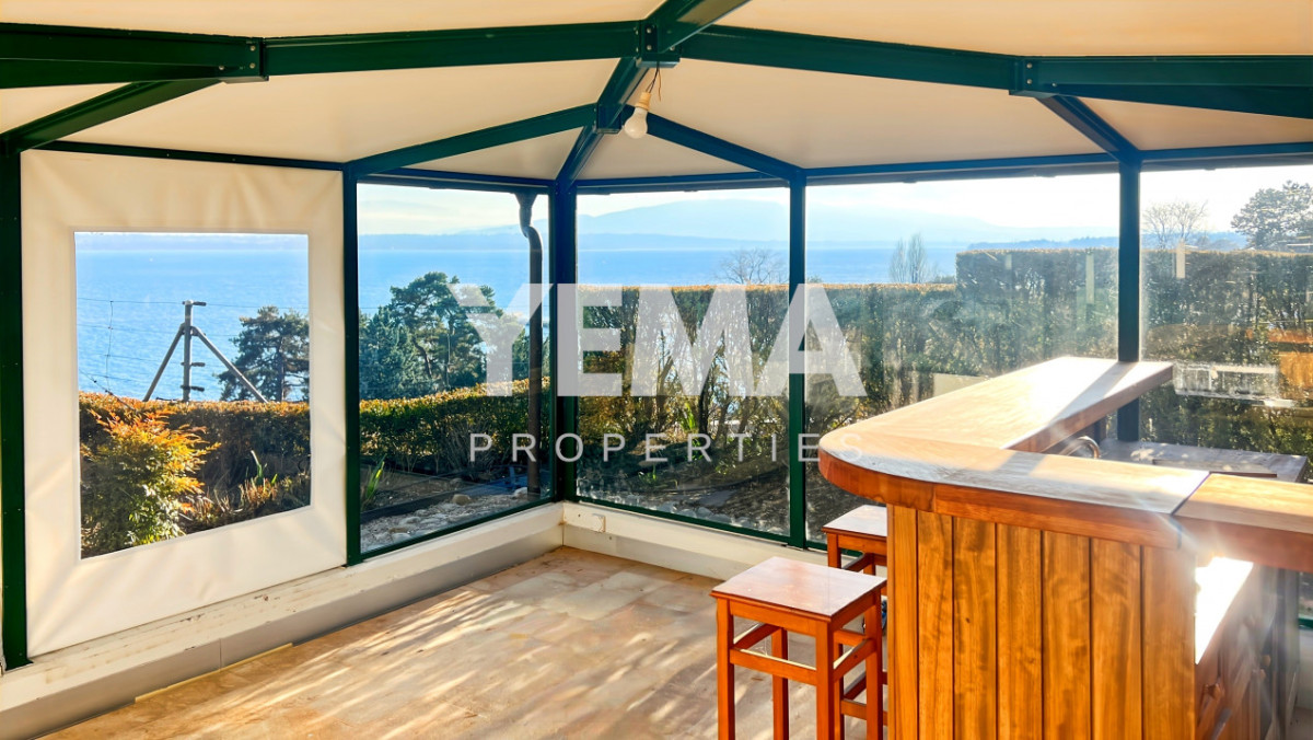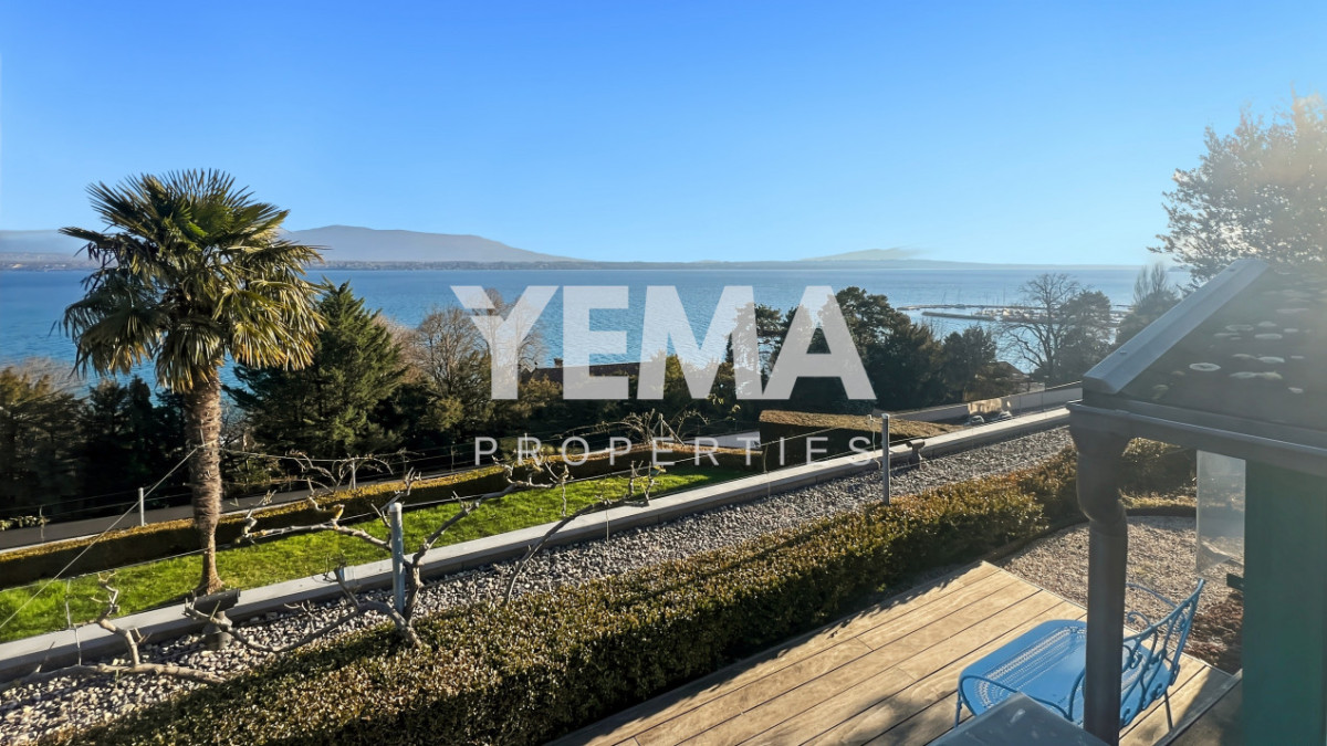 Depuis ses généreux espaces extérieurs comme depuis l’intérieur entièrement vitré, la propriété bénéficie d’une vue spectaculaire sur le lac Léman, les Alpes et le Jet d’eau, offrant un panorama d’exception à toute heure de la journée.