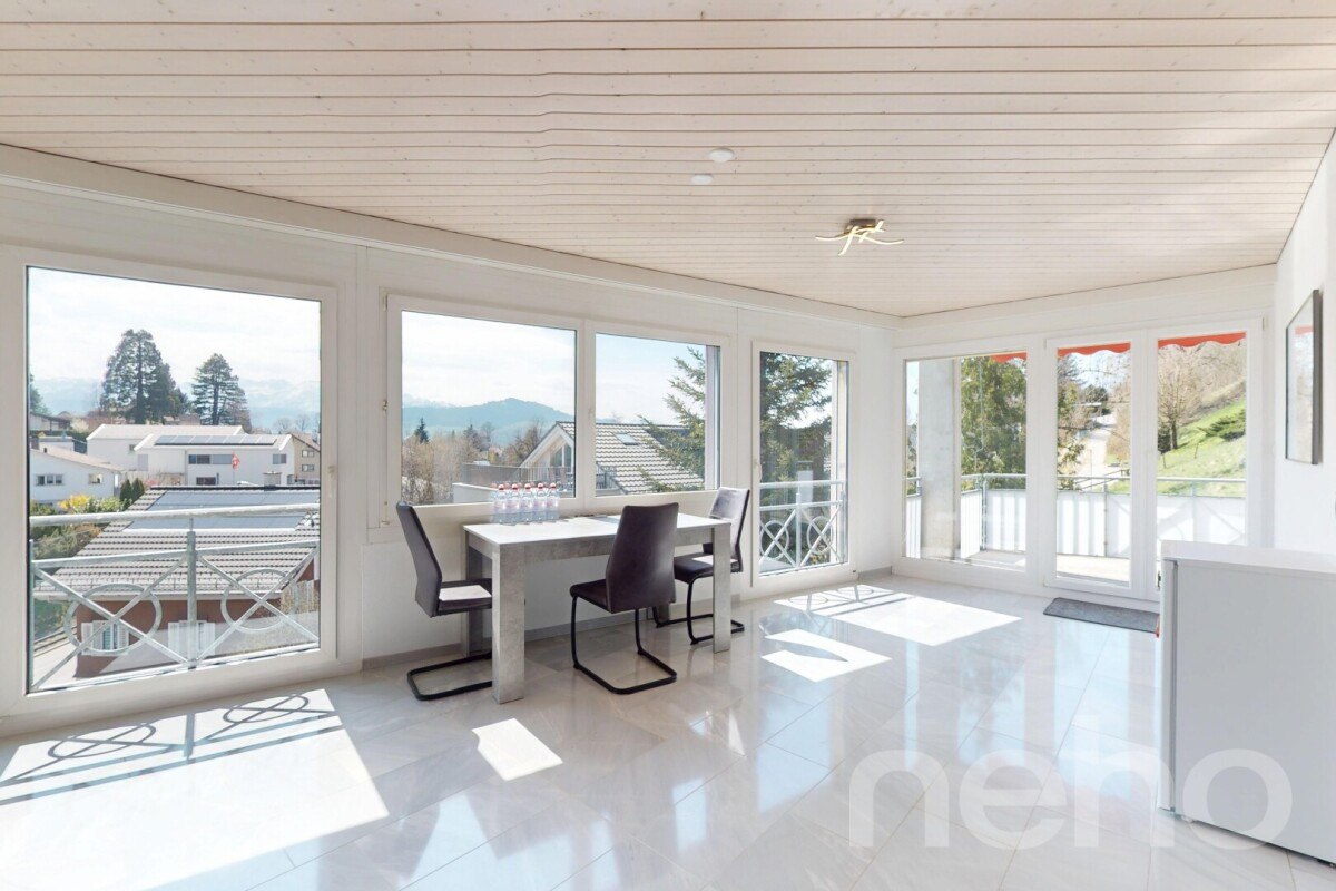Schon beim Eintreten wird die Grosszügigkeit und Helligkeit der Wohnung spürbar. Der offene Wohn- und Essbereich überzeugt durch raumhohe Fensterfronten, die nicht nur viel Tageslicht hereinlassen, sondern auch den Blick auf die grüne Umgebung freigeben. Ein echtes Highlight ist die unverbaute Sicht auf den Säntis, die zu jeder Tageszeit ein eindrucksvolles Panorama bietet. Der Wohnraum ist mit hochwertigen Steinplatten ausgestattet, die dem Ambiente eine zeitlos elegante Ausstrahlung verleihen. In den Schlafzimmern sorgt edles Parkett für Wärme und Behaglichkeit.