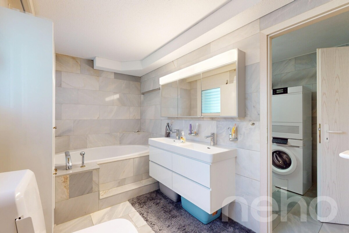 Die Wohnung verfügt über zwei moderne Badezimmer: eines mit Badewanne, WC und Doppellavabo, das zweite mit Dusche, WC und einem praktischen Waschturmplatz - ideal für Familien oder Paare mit Platzbedarf. Die Raumaufteilung ist durchdacht und funktional, ohne auf eine wohnliche Atmosphäre zu verzichten.