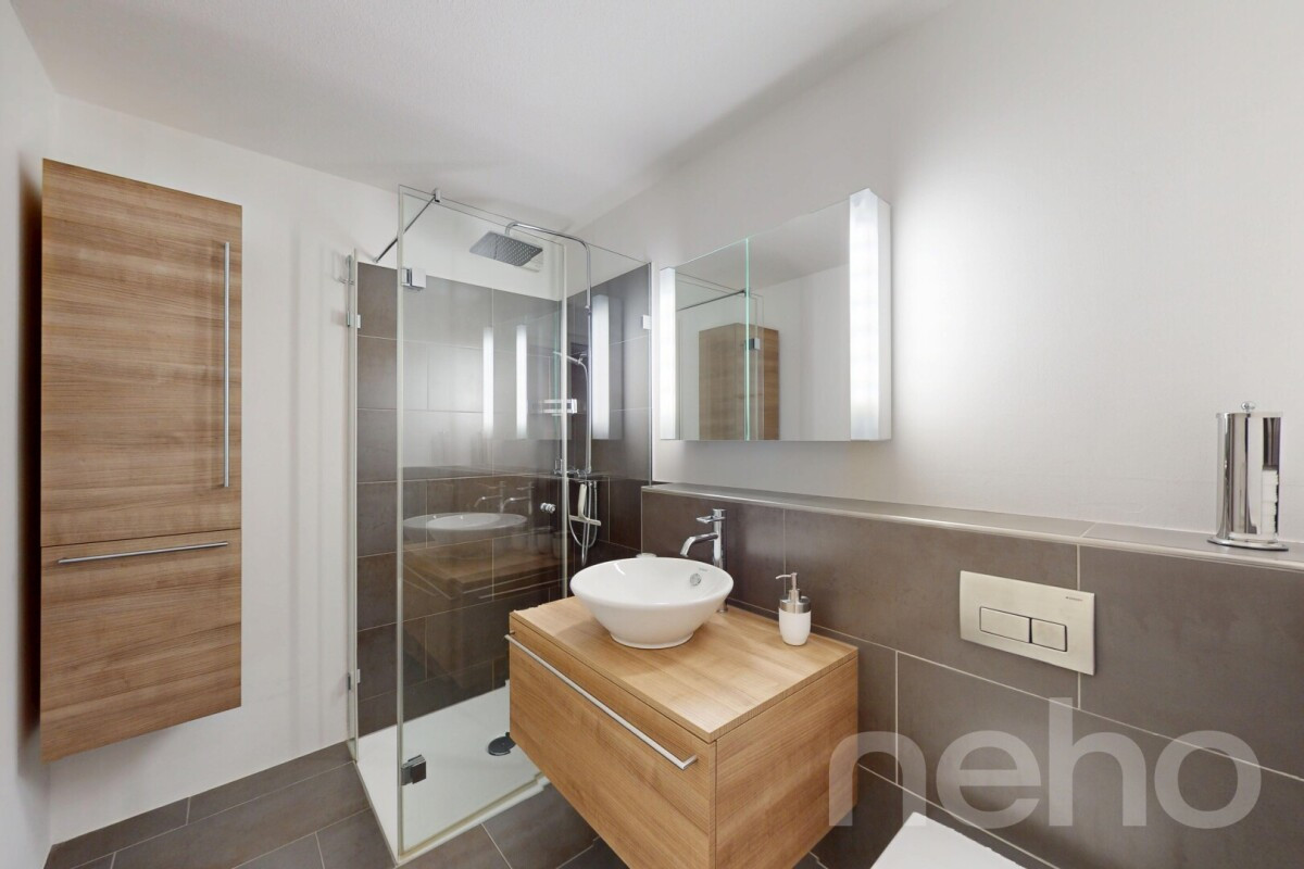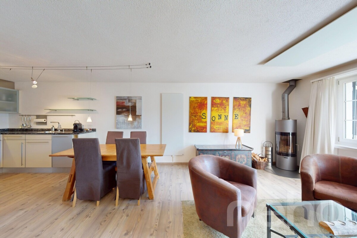 Der offene Wohn- und Essbereich mit moderner Küche und Cheminée bildet das Herzstück der Wohnung. Von hier gelangen Sie direkt auf die rund 15 m² grosse Terrasse, auf der Sie vom Morgen bis zum Abend Sonne und Weitsicht geniessen. Das grosszügige Schlafzimmer sorgt für erholsame Nächte, während das elegante Badezimmer mit bodenebener Dusche Komfort und Stil vereint.
