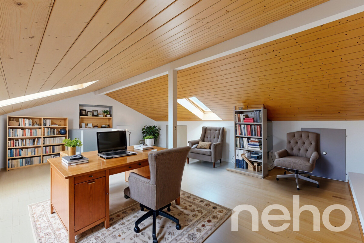 À l'étage, les combles de 74 m² PPE offrent de multiples possibilités d'aménagement (bureau, salle de jeux, chambre, etc.).