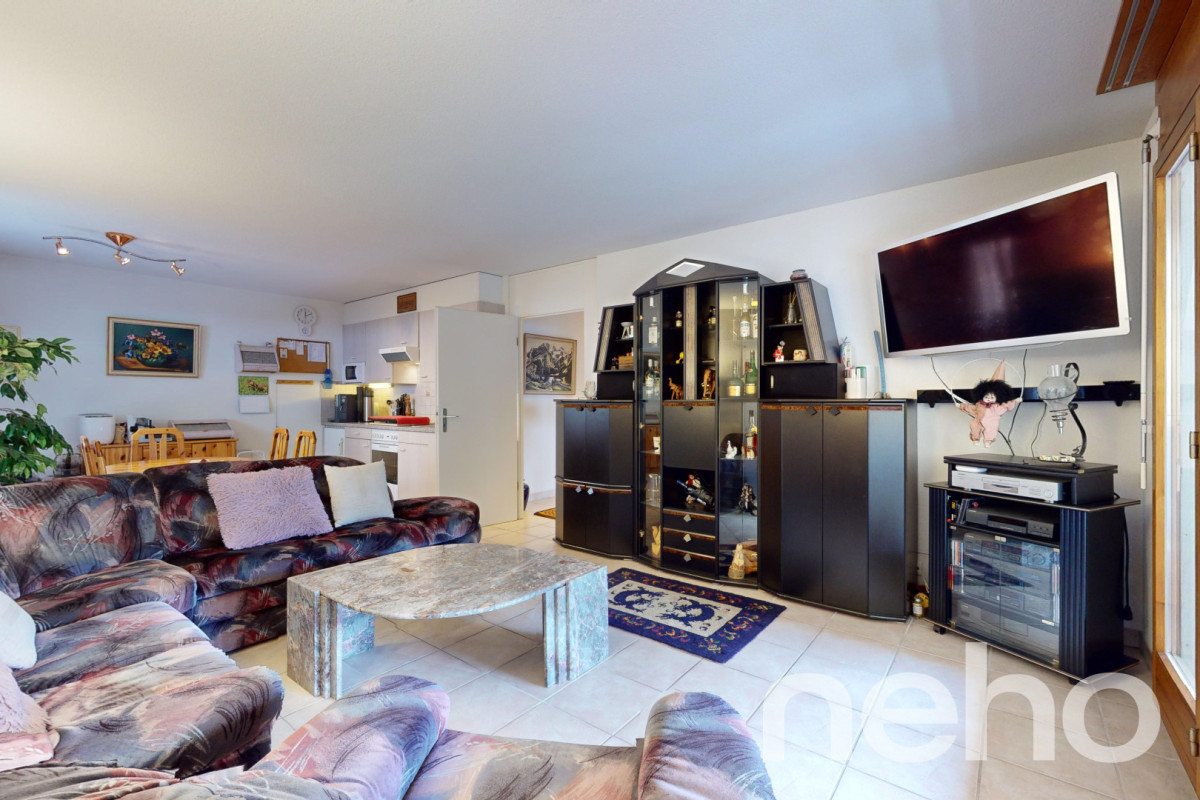 Ne manquez pas cette opportunité unique d'acquérir un spacieux appartement d'une surface pondérée de 84 m² au prix de vente de CHF 270'000, comprenant un balcon exceptionnellement grand, une vue imprenable, une place de garage ainsi qu'une place de parking extérieure.Cette résidence se distingue par de nombreux atouts et offre un accès facile aux services et commodités situés à proximité immédiate.L'un des points forts de ce bien est son balcon de 16 m², soit deux fois plus grand que les autres balcons de l'immeuble. Cet espace extérieur exclusif est accessible non seulement depuis le séjour, mais également directement depuis la chambre principale, offrant ainsi un confort supplémentaire et une magnifique vue.La place de parc est incluse dans le prix de vente et constitue un avantage majeur : l'appartement dispose d'une place de garage souterraine privative, inscrite au registre foncier, garantissant un stationnement sécurisé et sans contrainte. De plus, des places de parc extérieures sont mises à disposition exclusivement pour les résidents de l'immeuble ? un confort rare et très apprécié.Un autre élément particulièrement impressionnant de cette résidence est la vaste halle d'entrée mesurant 10 × 65 m, dont les dimensions rappellent les standards américains. Cet espace généreux dépasse largement la taille d'un salon classique et offre de multiples possibilités d'utilisation. Il comprend une salle de fitness moderne, un carnotzet ainsi qu'une table de ping-pong, et se prête parfaitement aux activités sportives et aux moments conviviaux. Cette surface exceptionnelle confère à l'immeuble un sentiment unique d'exclusivité et de grandeur.L'appartement bénéficie également de deux caves fermées, dont une pièce bétonnée inscrite au registre foncier, idéale pour le stockage sécurisé d'équipements sportifs coûteux, d'articles saisonniers ou comme espace de rangement supplémentaire.Un autre atout potentiel de la résidence est la piscine intérieure récemment rénovée, complétée par un sauna et un hammam. Bien que ces installations soient actuellement hors service pour des raisons financières, une future décision de la copropriété pourrait permettre leur remise en exploitation.Que ce soit comme résidence secondaire à la montagne ou comme résidence principale, cet appartement d'exception saura satisfaire les exigences les plus élevées. Profitez d'un confort de vie moderne au c?ur d'un environnement naturel remarquable.