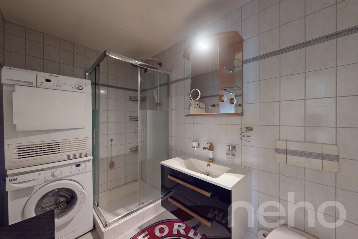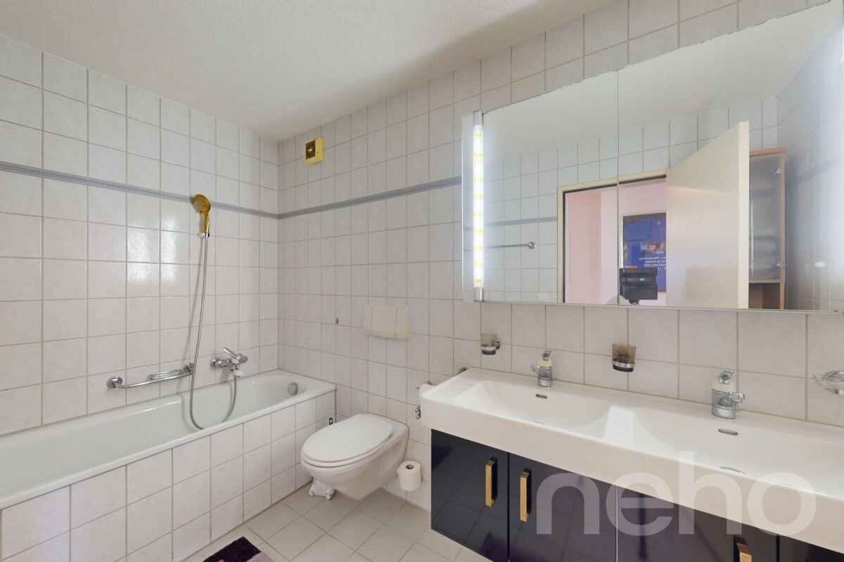 Die Wohnung verfügt über ein Badezimmer mit Badewanne, WC und Doppellavabo sowie eine separate Dusche/WC, ein eigener Waschturm (Waschmaschine + Tumbler) ist ebenfalls integriert.