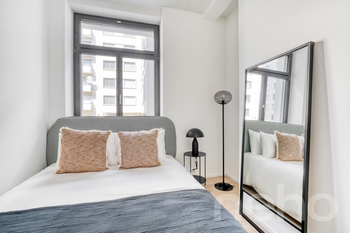 This spacious ground-floor loft apartment near Kappeli is located in a comprehensively renovated building in the heart of Altstetten and has previously been rented as a business apartment. It impresses with high-quality solid oak parquet flooring (wide plank) and features an open-plan kitchen with state-of-the-art appliances, a bathroom with elegant porcelain stoneware, a rain shower and a bathtub, as well as a separate dressing room and many other amenities.