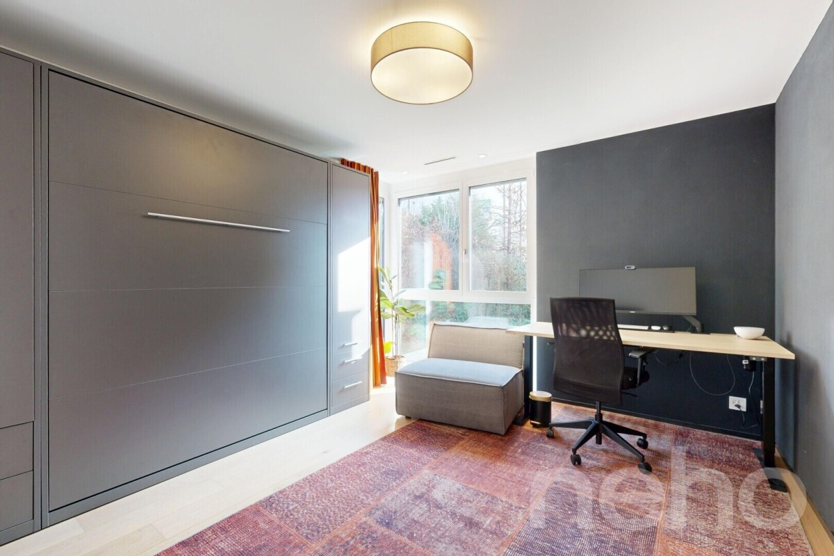 L'appartement dispose de deux chambres aux dimensions harmonieuses, dont une suite parentale, ainsi qu'une seconde chambre pouvant être utilisée de manière flexible comme chambre d'enfant, d'amis ou bureau. Une salle de bains supplémentaire avec réduit intégré offre l'espace nécessaire pour une machine à laver et un sèche-linge.