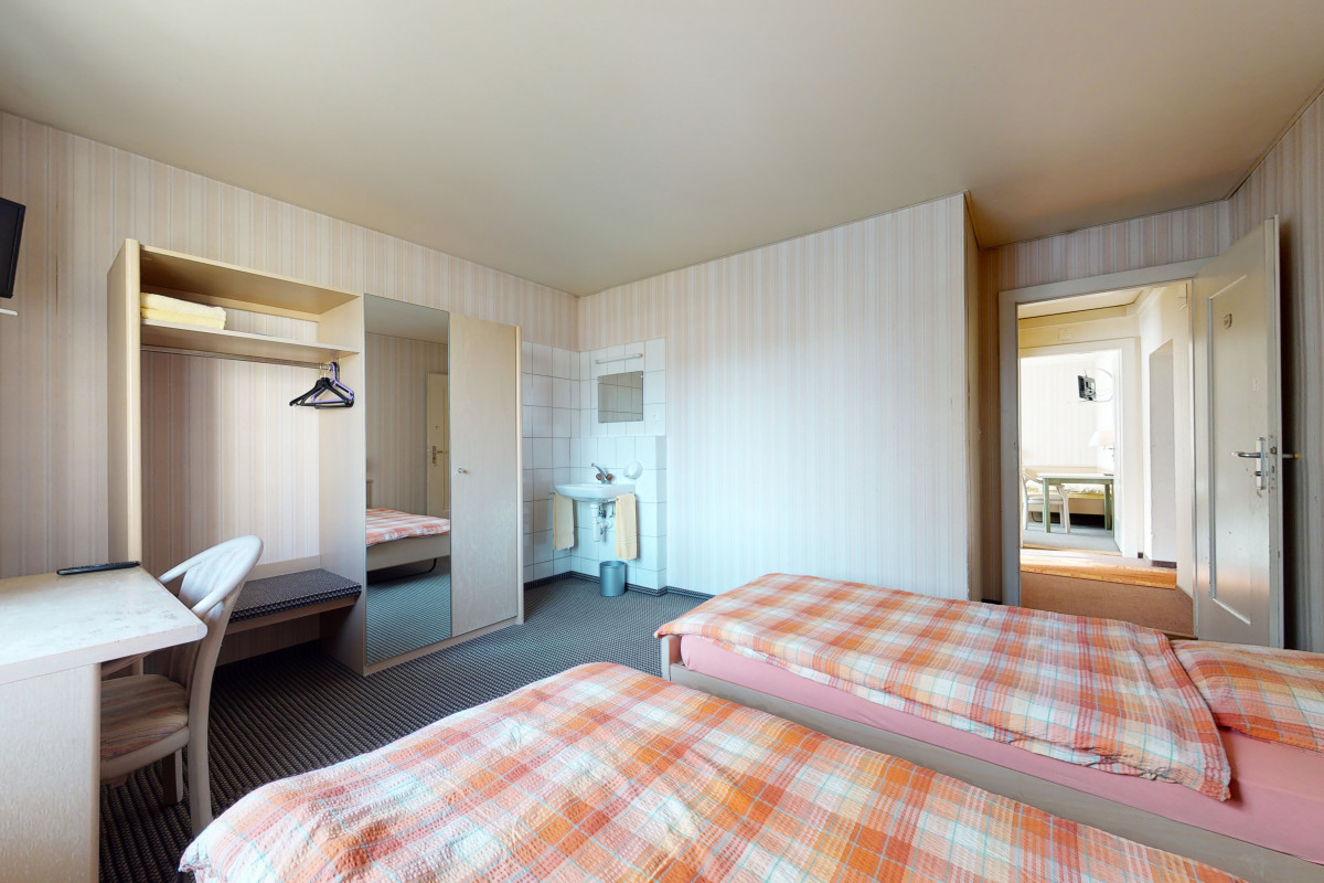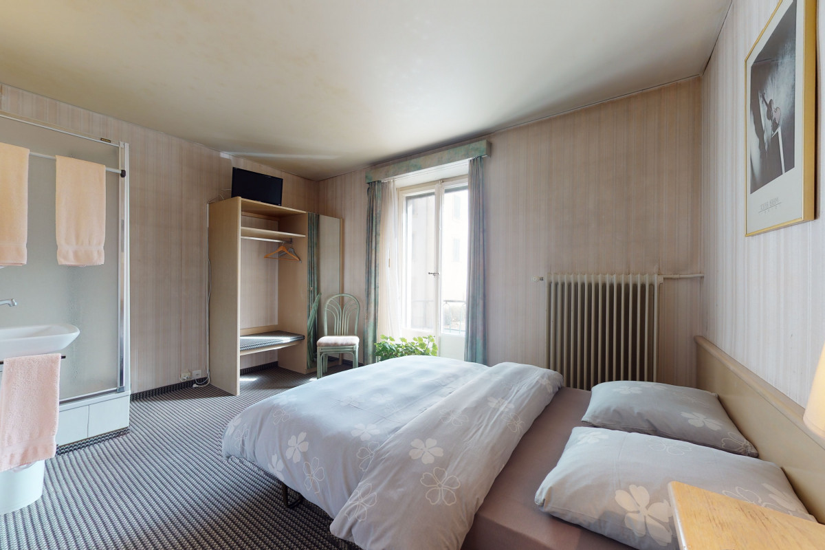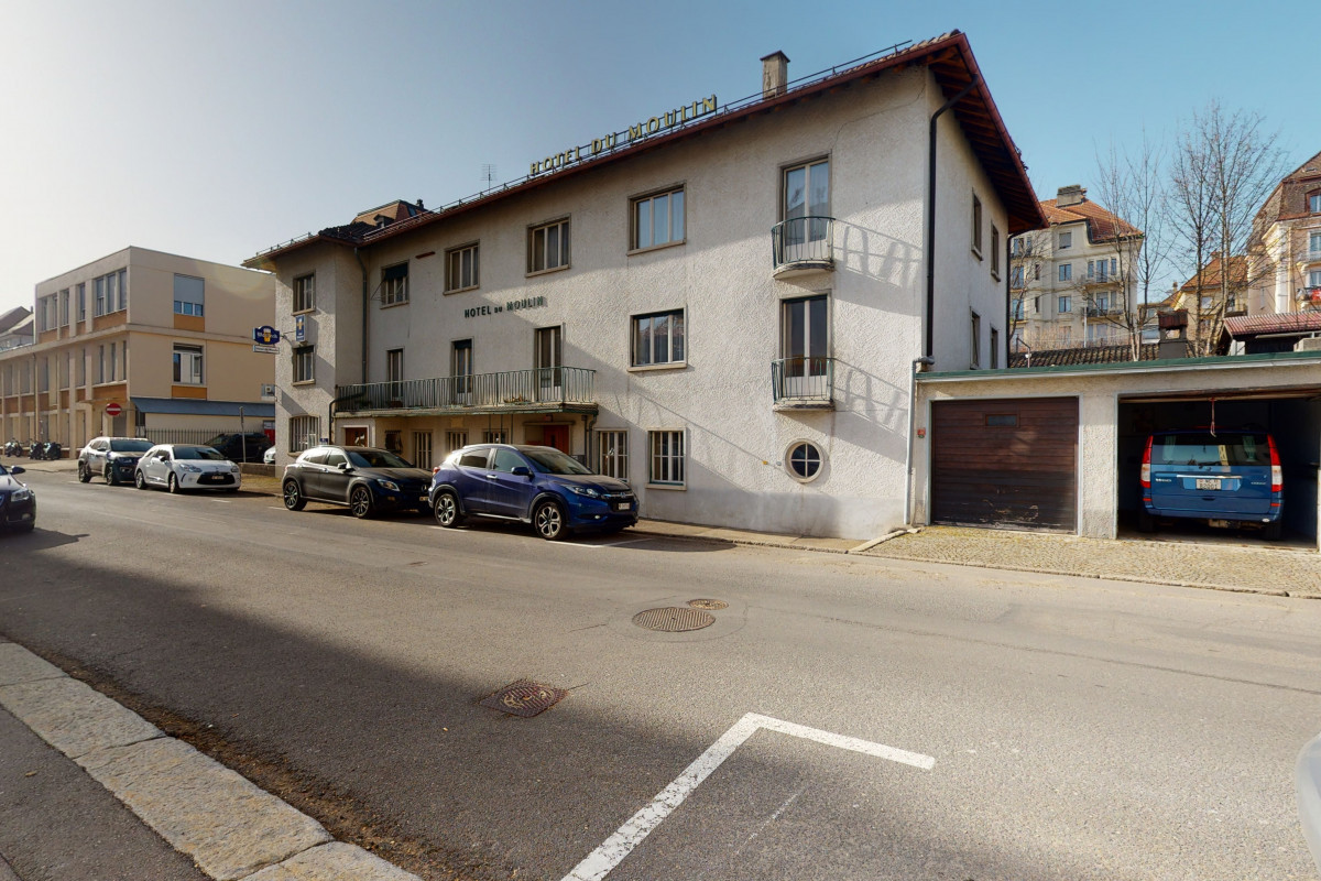 Cet ancien hôtel offre un potentiel énorme puisque sa surface au sol et sa hauteur peuvent être augmentées. Il peut être transformé en appartements, lofts et/ou bureaux. Le rez-de-chaussée est composée d'une réception, d'une cuisine professionelle, d'une grande salle à manger avec bar et d'un ancien bowling. Le premier étage se compose d'un bel appartement de 3.5 pièces. Le reste du 1er et le 2e étage se composent de 15 chambres d'hôtel, la plupart avec douche et lavabo et 3 groupes sanitaires.