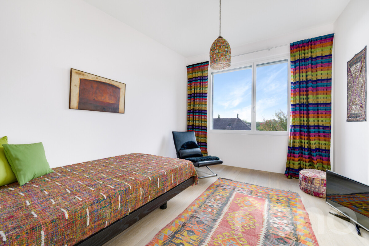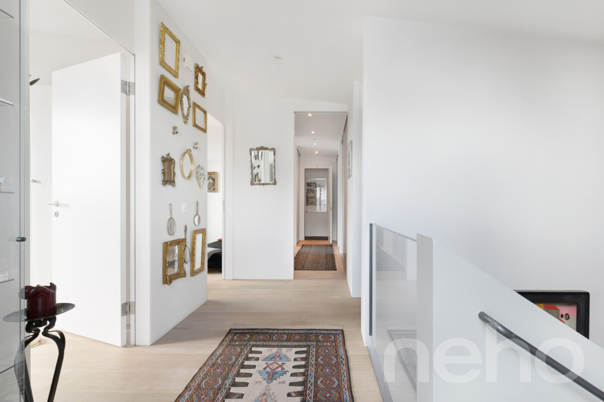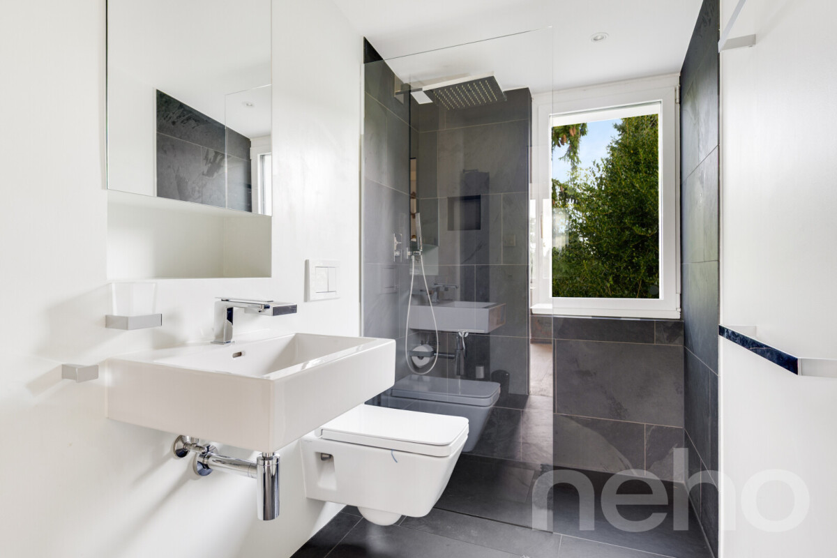Im Obergeschoss erwarten Sie drei geräumige Schlafzimmer, eine praktische Ankleide und zwei moderne Badezimmer mit begehbaren Duschen. Eines der Bäder verfügt zusätzlich über ein Doppellavabo und eine Badewanne sowie direkten Zugang zum Balkon. Ein separates Gäste-WC komplettiert das Raumangebot auf dieser Etage.