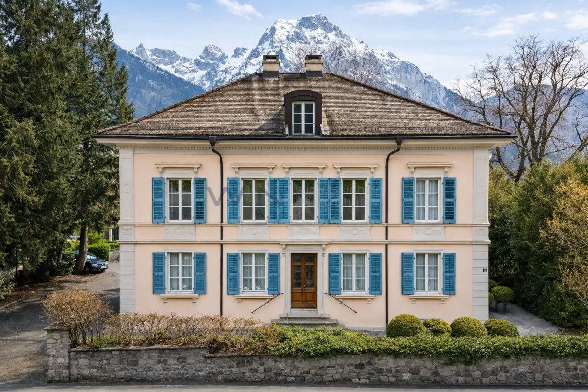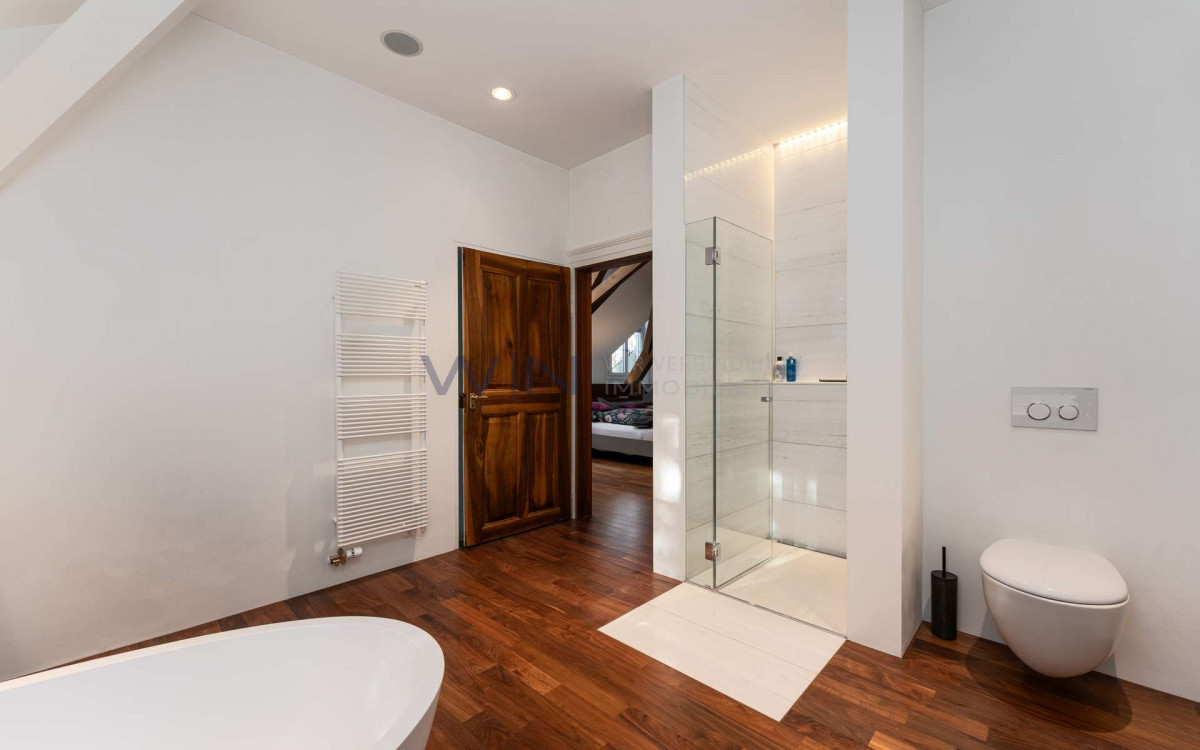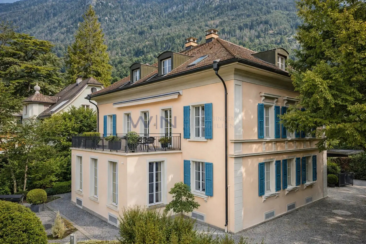 Massive Aussenwände, holzverkleidete Wandfelder an den hohen Wänden in Kassettenbauweise mit subtilen Zierfräsungen sowie hochwertige Parkettböden lassen jeden Raum seinen eigenen Charakter ausleben, in harmonischer Folge, grosszügig und dennoch klar zoniert. Die ornamentalen Stuckeinlagen an den Decken, grosszügigen Fensterfronten und die massiven, hohen Eichen-Türen in unvergleichlicher Eleganz sind nur ein kleiner Teil dieser Imposanz, die subtil Stil und Raffinesse vermittelt und ein Gefühl zeitloser Würde sowie historischer Tiefe erzeugt. Eine einzigartige Villa, die vielfach kopiert wurde, deren unverwechselbare Authentizität jedoch für immer dem Original vorbehalten bleibt.