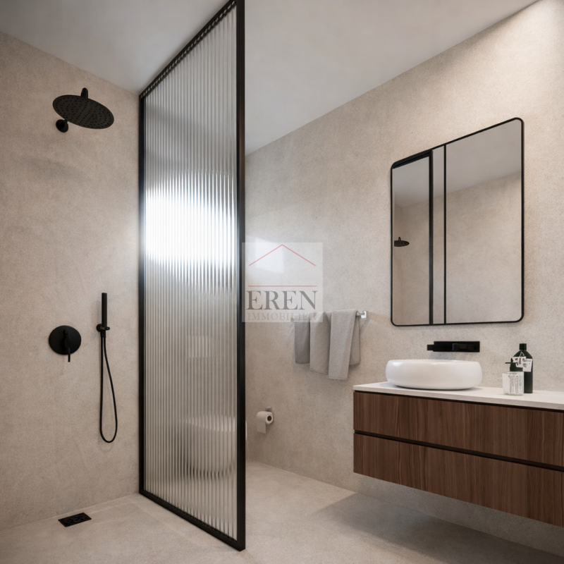 - Une salle de bains moderne avec baignoire, WC, double vasque et emplacement prévu pour une colonne de lavage