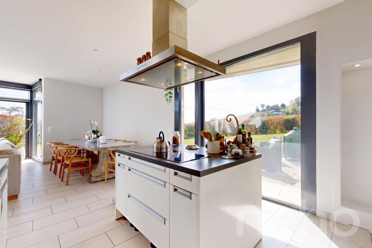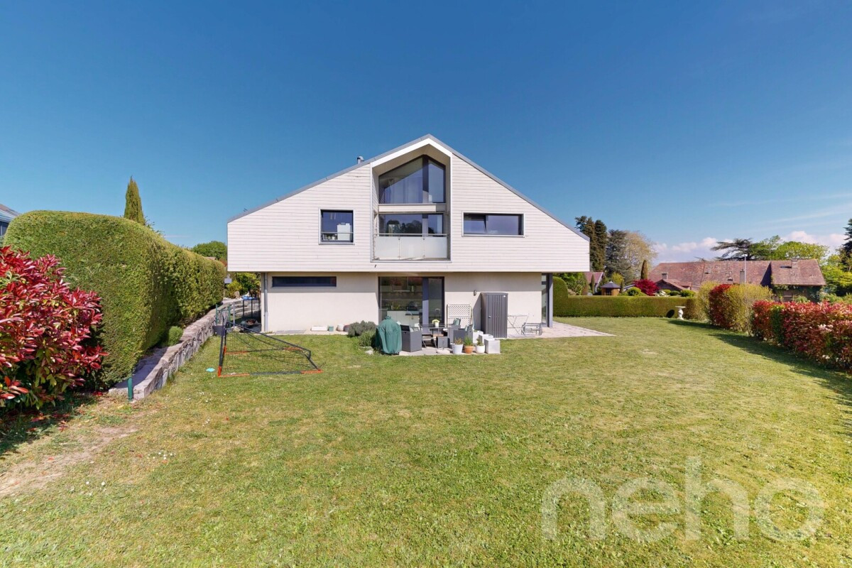 Sur les hauteurs d'Aubonne, dans le quartier résidentiel et confidentiel de Sous-Bougy, cette maison contemporaine au caractère architectural marqué dévoile une vue dégagée sur le lac Léman et les Alpes. Orientée plein sud-ouest, elle bénéficie d'un ensoleillement généreux toute la journée et profite du calme d'un secteur recherché, à quelques minutes du centre historique du village et de ses commerces.Au rez-de-chaussée, le séjour double hauteur impressionne dès le premier regard. Ses immenses baies vitrées inondent la pièce de lumière naturelle du matin au soir. La sensation d'espace est saisissante, portée par des volumes généreux et une luminosité exceptionnelle. La cuisine ouverte, équipée avec soin, s'ouvre sur une terrasse et sur le grand jardin parfaitement entretenu. À ce niveau se trouve également une chambre avec sa propre salle de douche.L'étage dessert trois chambres lumineuses, dont une suite parentale avec mezzanine et sa salle de bain privative. Les deux autres chambres partagent l'accès à un balcon, espace extérieur appréciable pour profiter de la vue et de la lumière du matin. Une seconde salle d'eau complète ce niveau et garantit un confort optimal au quotidien. Partout, les hauteurs sous plafond généreuses, la qualité des matériaux et le travail sur la lumière donnent à chaque pièce un véritable caractère.Le sous-sol, entièrement chauffé, abrite une très grande pièce polyvalente, idéale pour une salle de jeux, un home cinéma ou un espace fitness, ainsi qu'une buanderie, une cave et un local technique. Un accès indépendant depuis l'extérieur permet de rejoindre directement ce niveau, pratique au quotidien comme pour un usage autonome de l'espace.La maison dispose également de deux places de parking extérieures dont une couverte.