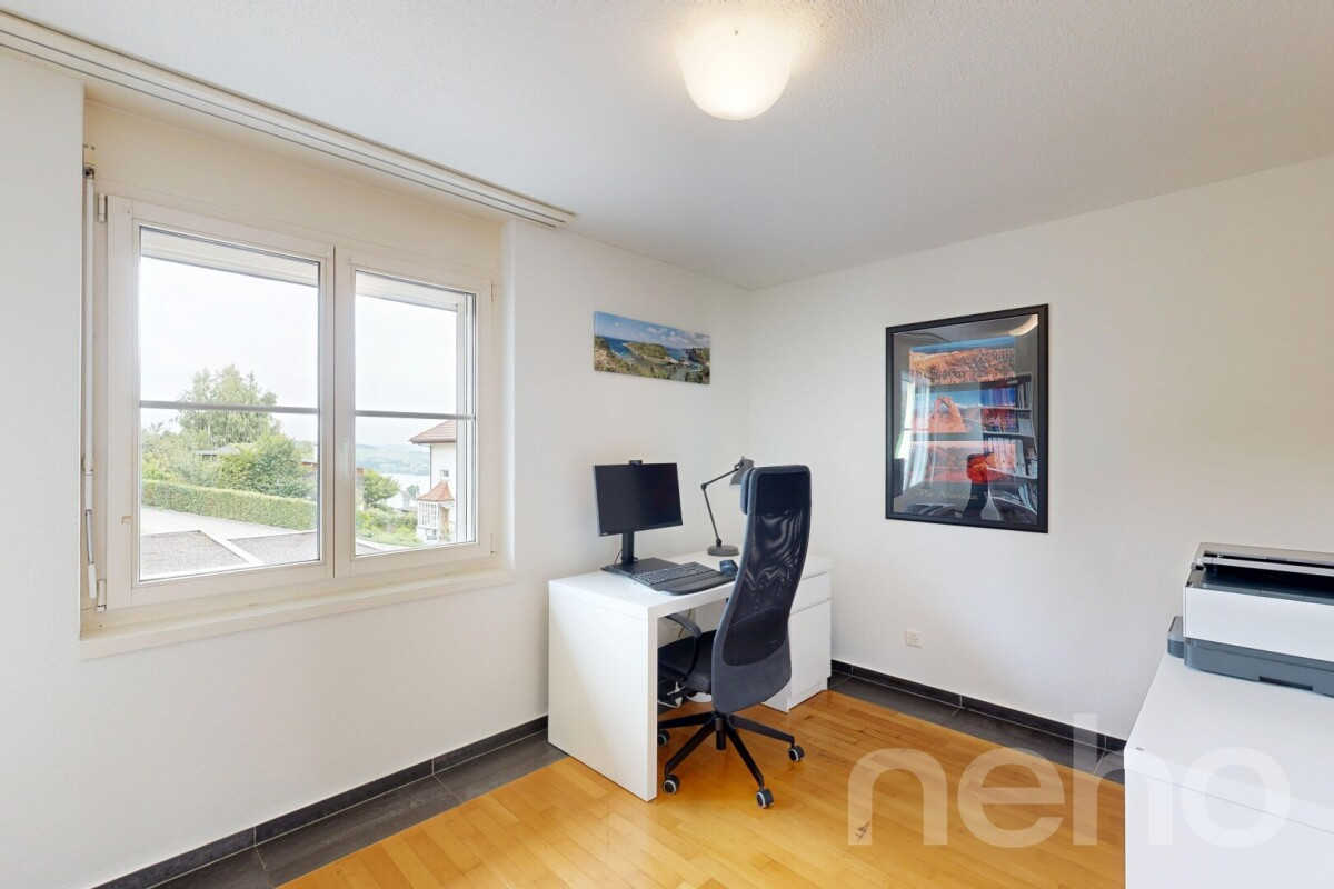Im Obergeschoss stehen vier vielseitig nutzbare Zimmer zur Verfügung, die sich als Schlaf-, Kinder- oder Arbeitsräume eignen. Das moderne Badezimmer ist mit Dusche und Badewanne ausgestattet. Vom Balkon aus geniessen Sie einen teilweise freien Blick auf den See.